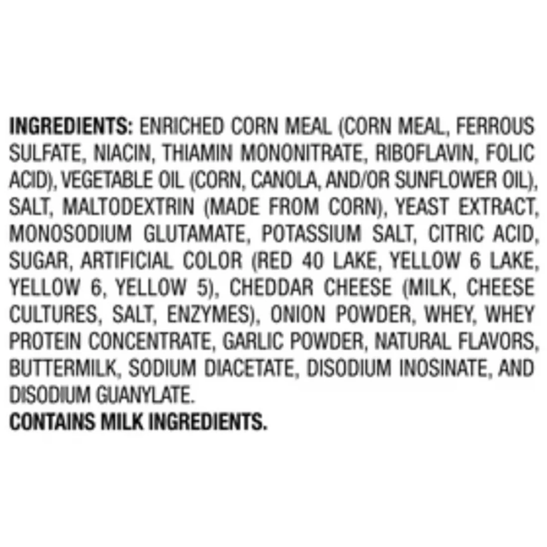 ingredients : دقيق الذرة المدعّم (دقيق الذرة، كبريتات الحديد، النياسين، ثيامين مونونيترات، ريبوفلافين، وحمض الفوليك)، زيت نباتي (الذرة، كانولا، و/أو زيت عباد الشمس)، توابل فلامين هوت (مالتوديكسترين [مصنوع من الذرة]، ملح، سكر، جلوتامات أحادي الصوديوم، مستخلص الخميرة، حمض الستريك، لون صناعي [أحمر 40 بحيرة، أصفر 6 بحيرة، أصفر 6، أصفر 5]، زيت عباد الشمس، جبن شيدر [حليب، مستنبتات الجبن، ملح، إنزيمات]، مسحوق البصل، مصل اللبن، تركيز بروتين مصل اللبن، مسحوق الثوم، نكهات طبيعية، كريمة حامضية، أسيتات الصوديوم، فوسفات إينوسينات ثنائي الصوديوم، وفوسفات غوانيلات ثنائي الصوديوم)، وملح.
