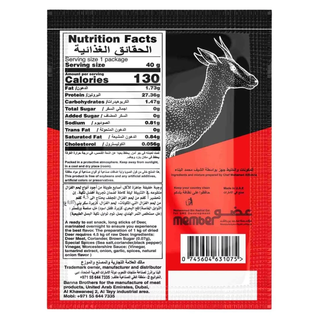 ingredients : لحم الغزال، كزبرة، الفلفل الأحمر المطحون، السكر البني (0.0009 غرام)، التوابل الخاصة: (ملح البحر، الكزبرة، الفلفل الأسود)، خل، صلصة ورشيسترشاير: (الخل، مستخلص التمر الهندي، البصل، الثوم، التوابل، نكهة البصل الطبيعية)
