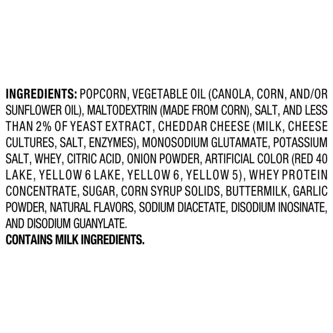 ingredients : فشار، زيت نباتي (الذرة، كانولا و/أو زيت عباد الشمس)، توابل فلامين’ هوت (مالتوديكسترين (مصنوع من الذرة)، ملح، مستخلص الخميرة، جبن شيدر (حليب، مستنبتات الجبن، ملح، إنزيمات)، جلوتامات أحادي الصوديوم، زيت عباد الشمس، مصل اللبن، كلوريد البوتاسيوم، حمض الستريك، لون صناعي (أحمر 40 بحيرة، أصفر 6 بحيرة، أصفر 6، أصفر 5)، مسحوق البصل، سكر، تركيز بروتين مصل اللبن، مواد سكرية من شراب الذرة، كريمة حامضية، مسحوق الثوم، نكهات طبيعية، أسيتات الصوديوم، فوسفات إينوسينات ثنائي الصوديوم، وفوسفات غوانيلات ثنائي الصوديوم).