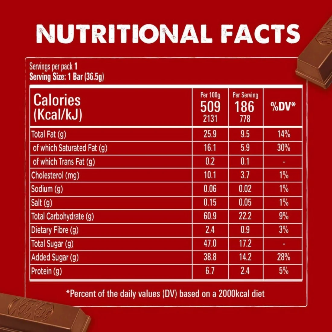 ingredients : سكر دقيق قمح مسحوق حليب بقري منزوع الدسم زبدة الكاكاو كتلة الكاكاو زيت نواة النخيل المهدرج مسحوق مصل اللبن منزوع المعادن من الحليب دهن الزبدة من الحليب الزيوت النباتية نخيل دهن عباد الشمس مسحوق كاكاو مخفض مستحلب من أصل نباتي ليسيثين الصويا ملح عامل رفع بيكربونات الصوديوم نكهة الفانيليا الطبيعية شوكولاطة الحليب تحتوي على 25 بالمائة على الأقل من المواد الصلبة الكاكاو