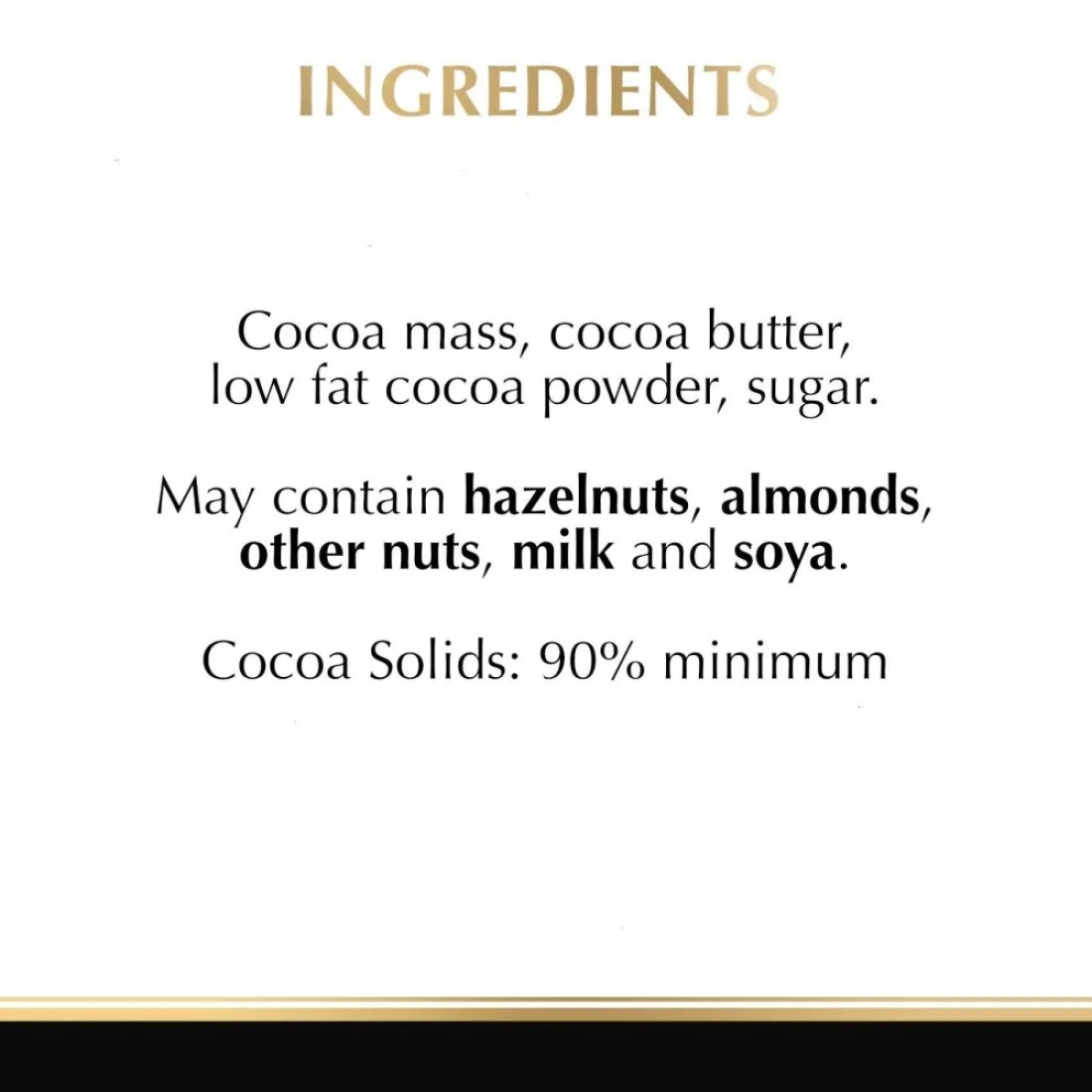 - شوكولاتة داكنة كاملة القوام تحتوي على 90٪ من الكاكاو ، و خشب الأبنوس الداكن ، مصنوعة ببراعة لتكون ناعمة و غنية ، بنكهة الكاكاو العميقة و مذاق متوازن بشكل مدهش li>