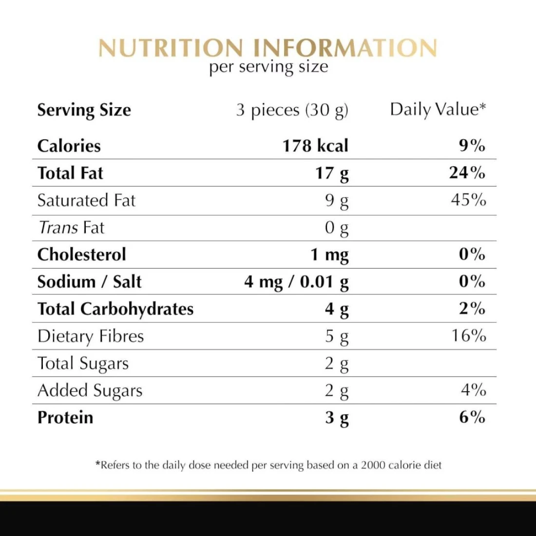 ingredients : كتلة الكاكاو ، زبدة الكاكاو ، مسحوق الكاكاو قليل الدسم ، سكر ، حبوب الفانيليا.