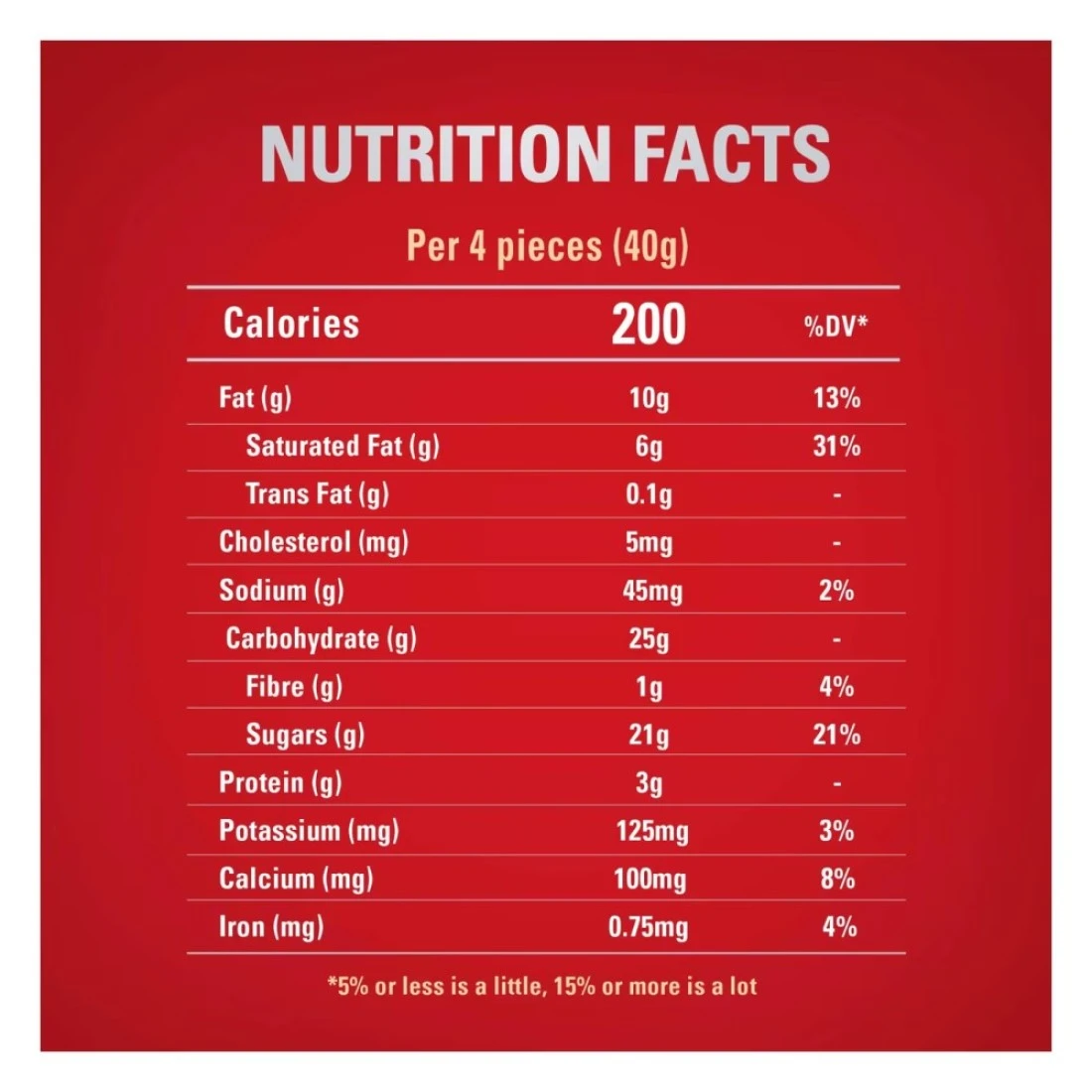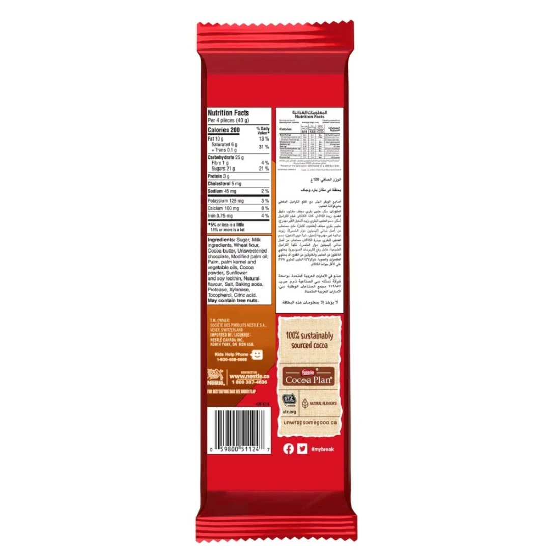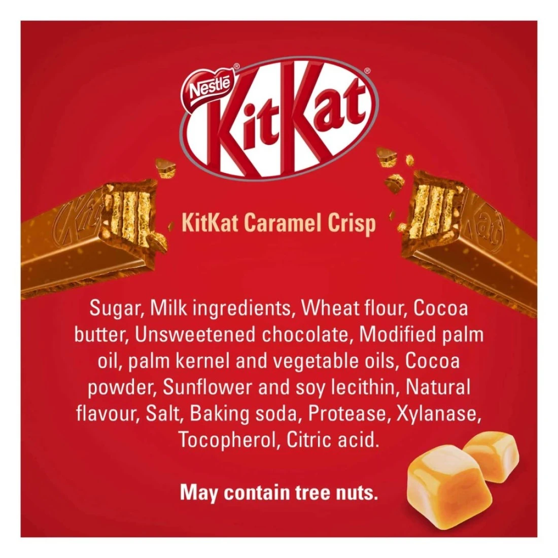 ingredients : سكر، مسحوق حليب بقري منزوع الدسم، رقائق كراميل مقرمشة، دقيق قمح، زبدة كاكاو، كتلة كاكاو، زيوت نباتية غير مهدرجة (زيت النخيل، زيت الشيا)، مصل اللبن منزوع المعادن، مسحوق (من الحليب)، دهن الزبدة (من الحليب)، مسحوق كاكاو قليل الدسم، مستحلب من أصل نباتي (ليسيثين الصويا، ليسيثين دوار الشمس)، نكهة طبيعية (كراميل، فانيليا)، ملح، عامل رفع (بيكربونات الصوديوم)