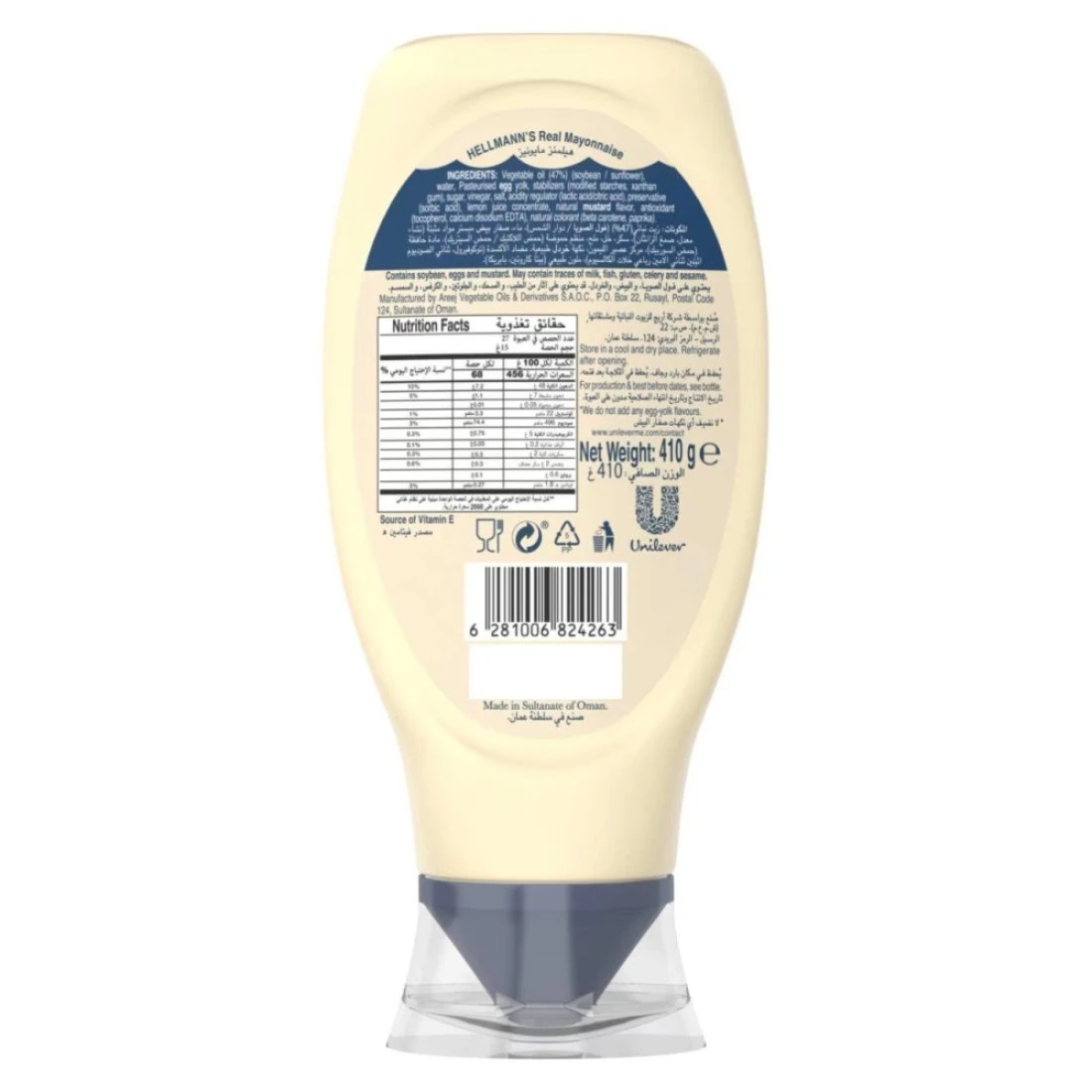 ingredients : ماء، زيت فول الصويا، مادة مكثفة (نشاء الذرة المعدل)، صفار بيض مبستر، خل، سكر، ملح، مثبت (صمغ الزانثان)، نكهة الخردل الطبيعية، منظم الحموضة (حمض اللاكتيك)، مادة حافظة (حمض السوربيك)، مركز عصير الليمون، مضاد للأكسدة. (ثنائي الصوديوم والكالسيوم EDTA).