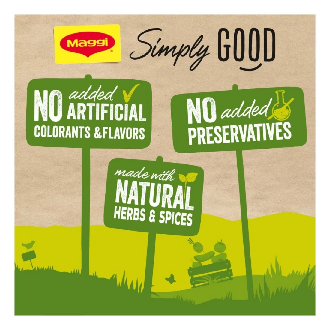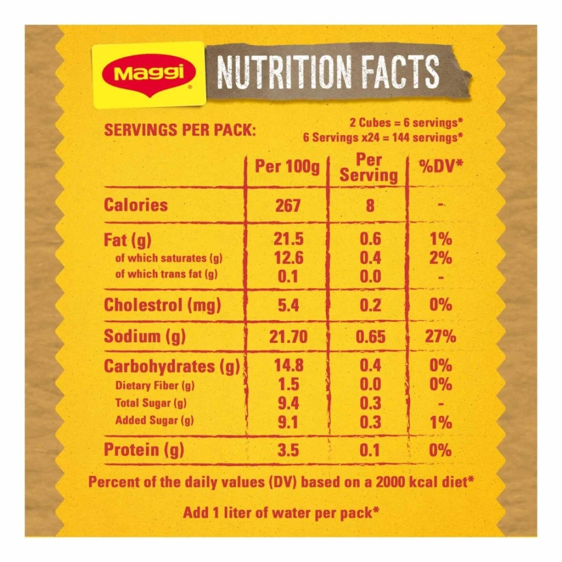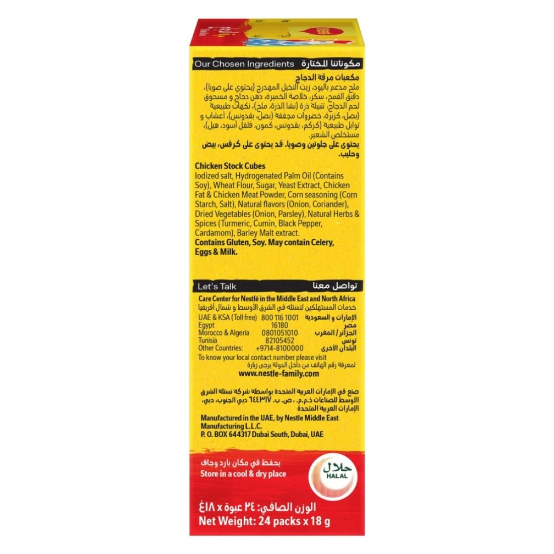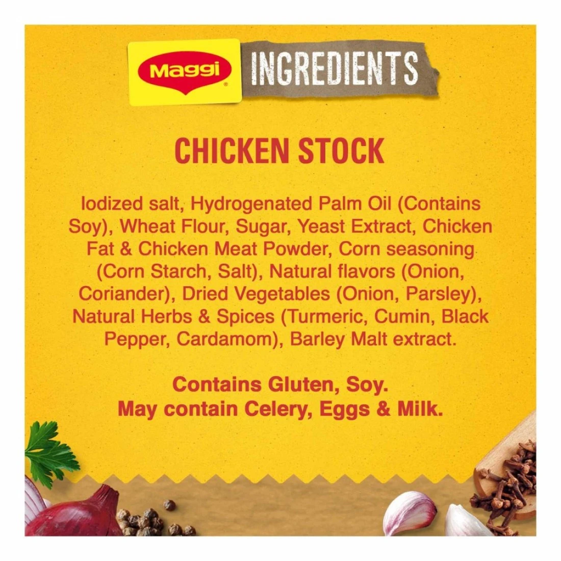 ingredients : ملح معالج باليود، زيت نخيل مهدرج (يحتوي على فول الصويا)، دقيق قمح، سكر، مستخلص الخميرة، دهن دجاج ومسحوق لحم دجاج، توابل الذرة (نشا الذرة، ملح)، نكهات طبيعية (بصل، كزبرة)، خضروات مجففة (بصل، بقدونس)، أعشاب وتوابل طبيعية (كركم، كمون، فلفل أسود، هيل)، مستخلص الشعير