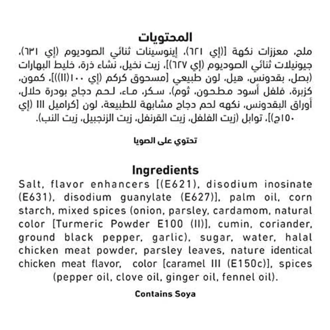 ingredients : ملح، معززات النكهة [(E621)، إينوزينات ثنائي الصوديوم (E631)، غوانيلات ثنائي الصوديوم (E627)]. زيت النخيل، نشا الذرة، بهارات مختلطة (بصل، بقدونس، هيل، لون طبيعي [مسحوق الكركم E100 (II)]، كمون، كزبرة، فلفل أسود مطحون، ثوم)، سكر، ماء، مسحوق لحم دجاج حلال، أوراق بقدونس، نكهة لحم دجاج مطابقة للطبيعة، لون [كاراميل III (E150c)]، بهارات (زيت الفلفل، زيت القرنفل، زيت الزنجبيل، زيت الشمر)