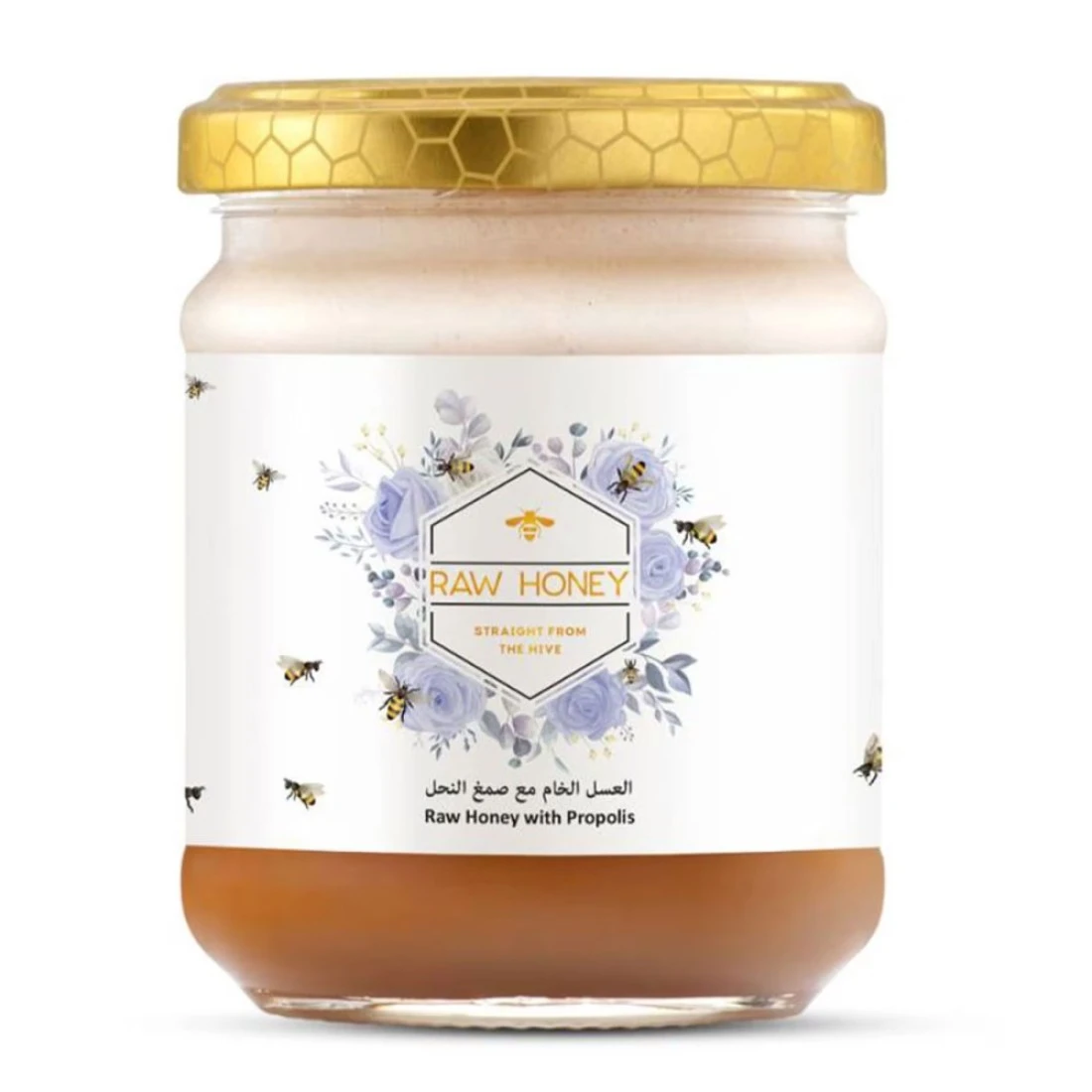 - يعد العسل الخام مع البروبوليس مزيجًا من العسل والبروبوليس، وهي مادة راتنجية تجمعها نحل العسل من براعم الأشجار وتستخدمها لإغلاق خلاياها وحمايتها