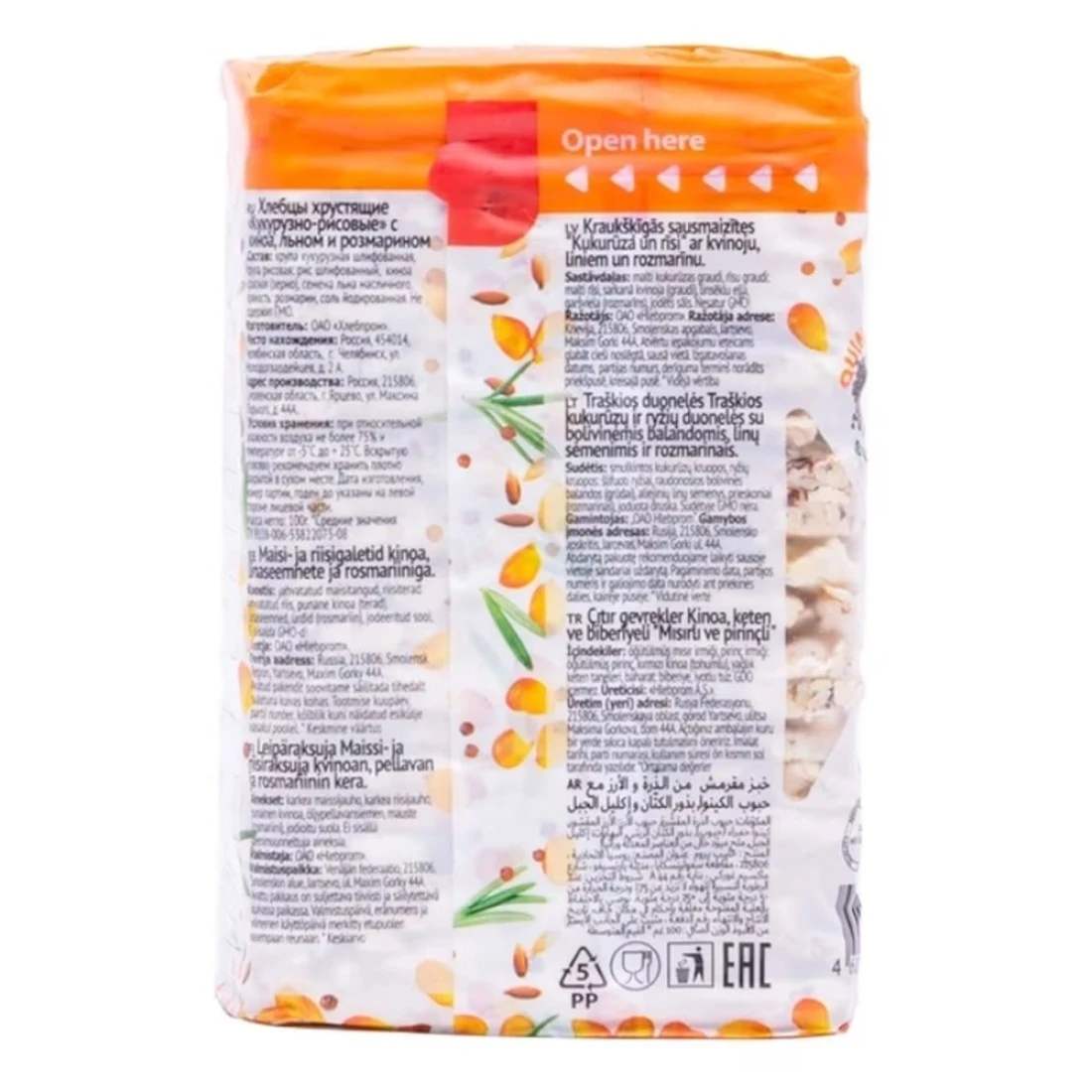 ingredients : فريك الذرة المطحونة، فريك الأرز، الأرز المطحون، الكينوا الحمراء (حبوب)، زيت بذور الكتان، التوابل، إكليل الجبل، الملح المعالج باليود