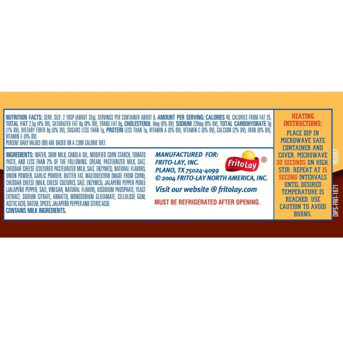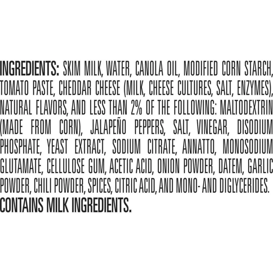 ingredients : حليب خالي الدسم، ماء، زيت كانولا، نشا الذرة المعدل، معجون الطماطم، جبنة شيدر (حليب، ثقافات الجبن، ملح، إنزيمات)، نكهات طبيعية، وأقل من 2% من المكونات التالية: مالوديكسترين (مشتق من الذرة)، فلفل هالبينو، ملح، خل، فوسفات ثنائي الصوديوم، مستخلص الخميرة، سترات الصوديوم، أناتو، جلوتامات أحادي الصوديوم، صمغ السليلوز، حمض الخليك، مسحوق البصل، DATEM، مسحوق الثوم، مسحوق الفلفل الحار، التوابل، حمض الستريك، و المونو-ديغليسيريد.