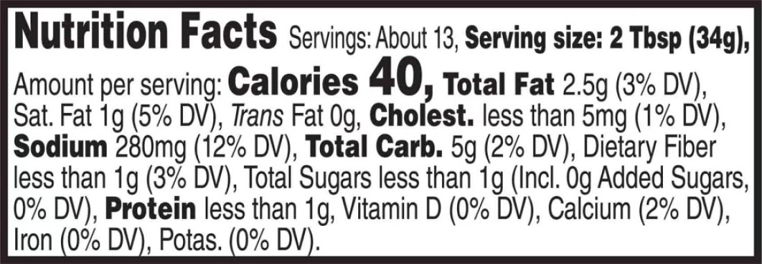 ingredients : ماء، حليب خالي الدسم، جبن مونتيري جاك (حليب، ثقافات الجبن، ملح، إنزيمات)، زيت نباتي (زيت الذرة، زيت دوار الشمس و/أو زيت الكانولا)، نشا الذرة المعدل، طماطم مفرومة في عصير الطماطم، فلفل هالبينو، فلفل تشيلي، فلفل أحمر حلو، مالوديكسترين (مصنوع من الذرة)، وأقل من 2% من المكونات التالية: ملح، جبن شيدر (حليب، ثقافات الجبن، ملح، إنزيمات)، نكهات طبيعية (بما في ذلك نكهة الشيدر الطبيعية)، سداسي ميتافوسفات الصوديوم، أحادي جلوتامات الصوديوم، DATEM، فوسفات الصوديوم، توابل، و لون صناعي (اللون الأصفر 5، اللون الأصفر 6).