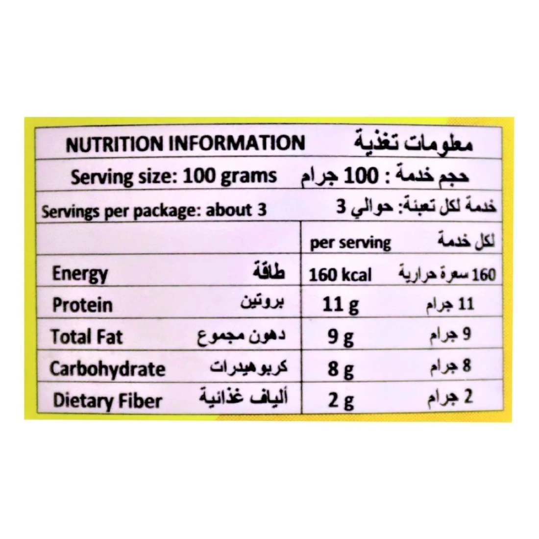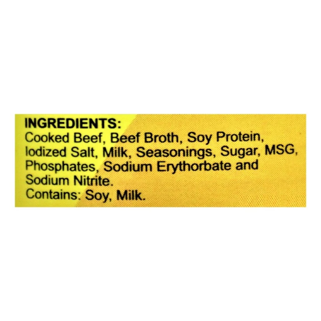ingredients : لحم بقري مطبوخ (لحم بقري مملح بالماء ، ملح ، سكر ، فوسفات الصوديوم ، نتريت الصوديوم) ، مرق لحم بقري ، شحم البقر ، معزول بروتين الصويا ، مركز فول الصويا المركّز (مضاف إليه لون الكراميل) ، ملح ، جلوتامات أحادي الصوديوم ، نكهة (بروتين الصويا المتحلل بالماء ، بروتين الذرة ، غلوتين القمح ، دهون ثلاثية متوسطة السلسلة ، زيت السمسم ، خلاصة الخميرة ، مسحوق الثوم ، سكر ، مسحوق البصل بسكر العنب ، صمغ الزانثان