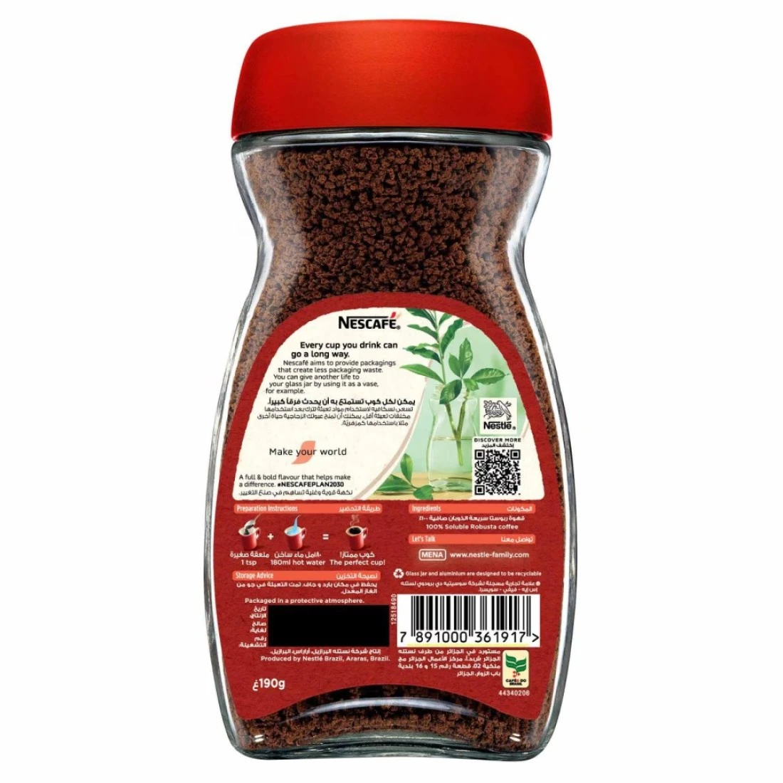 - رائحة غنية: جرب رائحة نسكافيه الكلاسيكية القوية والمنعشة المصنوعة من حبوب أرابيكا وروبوستا عالية الجودة