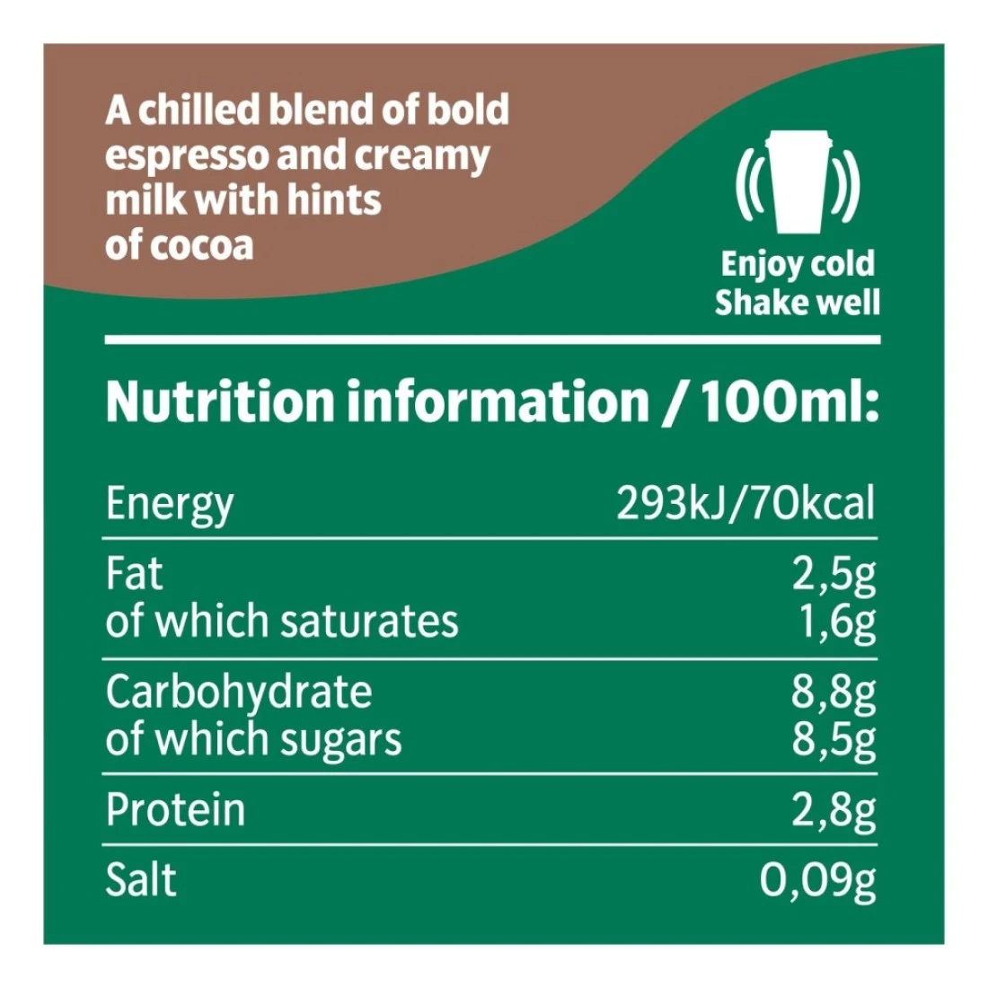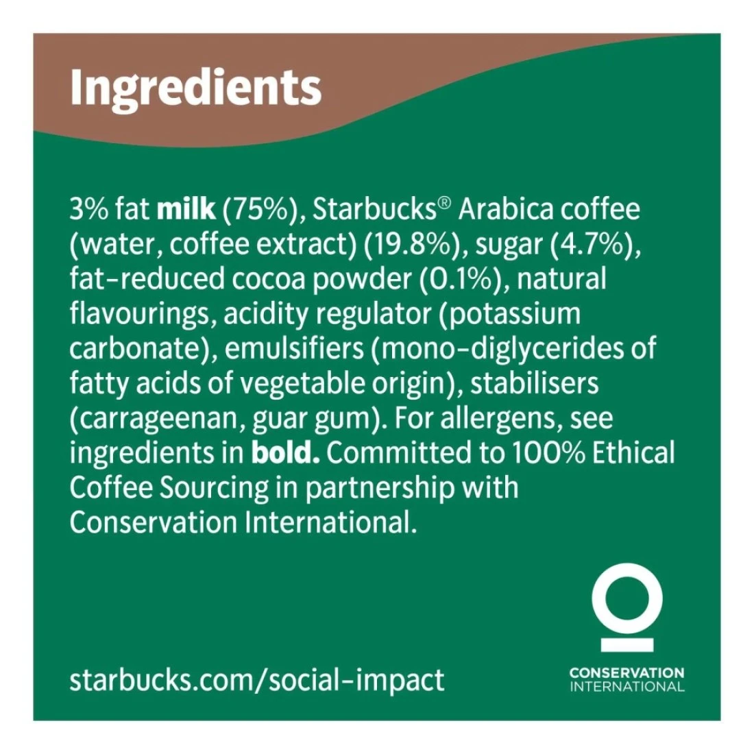 ingredients : حليب 3% دسم (75%)، قهوة أرابيكا ستاربكس (ماء، مستخلص قهوة) (198%)، سكر (47%)، مسحوق كاكاو قليل الدسم (0.1%)، نكهة طبيعية، نكهة فانيليا، منظم حموضة (كربونات البوتاسيوم)، مثبتات (كاراجينان، صمغ الغوار)، مستحلبات (أحادي وثنائي الجلسريد من الأحماض الدهنية من أصل نباتي)، قهوة، سكر ومسحوق كاكاو متداول وفقًا لمعايير التجارة العادلة، إجمالي 94%، باستثناء الماء ومنتجات الألبان