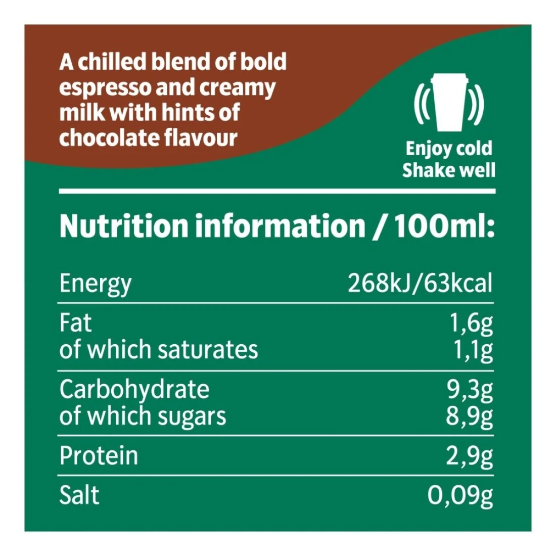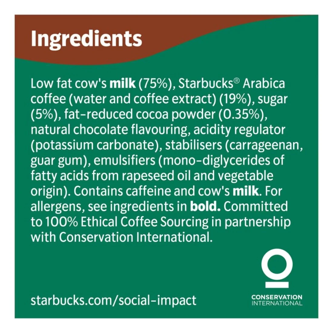 ingredients : حليب بقري قليل الدسم (75%)، قهوة أرابيكا ستاربكس (ماء ومستخلص قهوة) (19%)، سكر (5%)، مسحوق كاكاو قليل الدسم (0.35%)، نكهة شوكولاتة طبيعية، منظم حموضة (كربونات البوتاسيوم)، مثبتات (كاراجينان، صمغ الغوار)، مستحلبات (أحادي وثنائي جليسريد الأحماض الدهنية من زيت بذور اللفت وأصل نباتي)