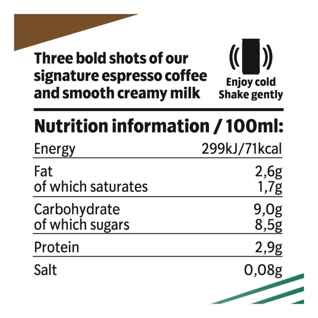ingredients : 33% حليب دسم (75%)، قهوة أرابيكا ستاربكس (ماء، مستخلص قهوة) (20%)، سكر (47%)، نكهة قهوة طبيعية، منظم حموضة (كربونات البوتاسيوم)