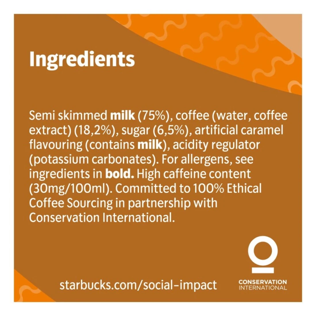 ingredients : حليب نصف دسم (75%)، قهوة (ماء، مستخلص قهوة) (182%)، سكر (65%)، نكهة كراميل اصطناعية (تحتوي على حليب)، منظم حموضة (كربونات البوتاسيوم)