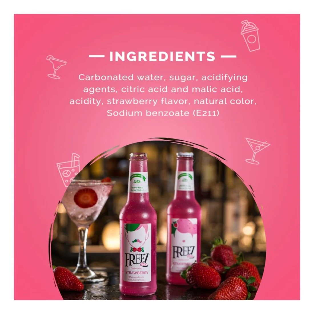 ingredients : مياه غازية، سكر، مواد محمضة، حامض الستريك وحمض الماليك، الحموضة، نكهة الفراولة، لون طبيعي، بنزوات الصوديوم (E211).