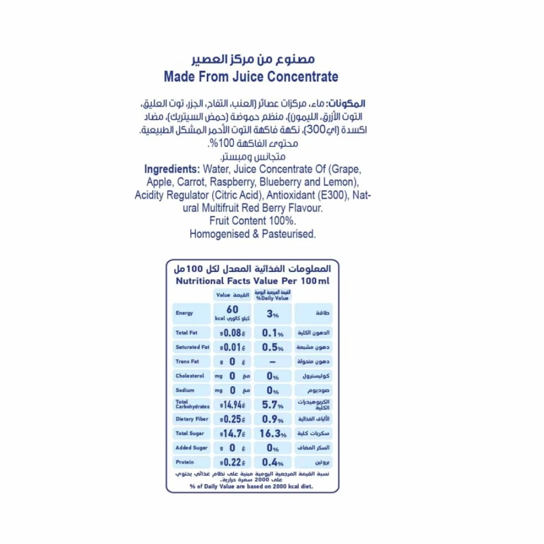 ingredients : ماء، هريس توت العليق، عصير عنب أحمر مركز، عصير ليمون مركز، سكر، عصير توت أسود مركز، فيتامين سي، نكهة توت العليق.