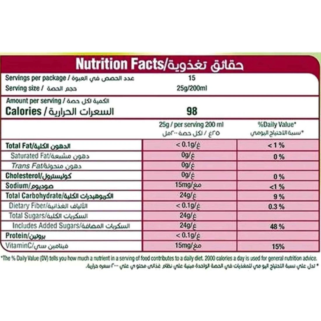ingredients : سكر، أحماض (حمض الستريك)، مكثفات (صمغ الزانثان، كربوكسي ميثيل السليلوز الصوديوم، الصمغ العربي)، عامل مضاد للتكتل (فوسفات ثلاثي الكالسيوم)، مالتوديكسترين مانغو صناعي، ألوان (ثاني أكسيد التيتانيوم، أصفر ، كبريتات الأمونيا كراميل، ألورا ريد أي سي)، منظم الحموضة (سترات ثلاثي الصوديوم) وفيتامين c