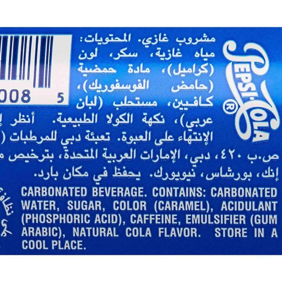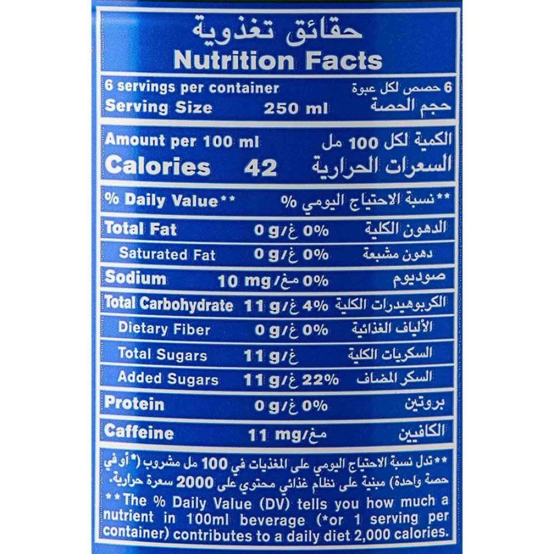 ingredients : مياه غازية، لون (كراميل)، مادة حمضية (حمض الفوسفوريك)، كافيين، مستحلب (صمغ عربي)، نكهات الكولا الطبيعية .