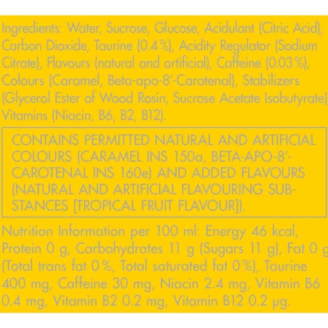 ingredients : ماء، سكر، غلوكوز، حامض الستريك، ثاني أكسيد الكربون، توراين 0.4%، منظم الحموضة بيكربونات الصوديوم، نكهات طبيعية وصناعية، منظم الحموضة كربونات المغنيزيوم، لون الكراميل، الكافيين 0.03%، نياسين، حمض البانتوثينيك، فيتامين ب6، لون الريبوفلافين، الطاقة. مشروب الطاقة، مشروبات الطاقة الاستوائية، 250 ملل، 4 حزمات