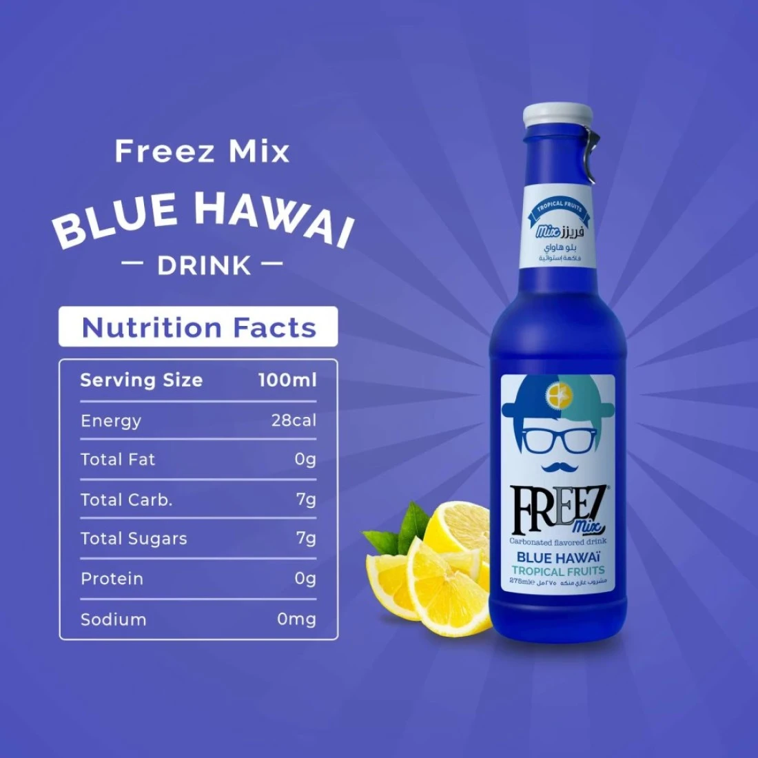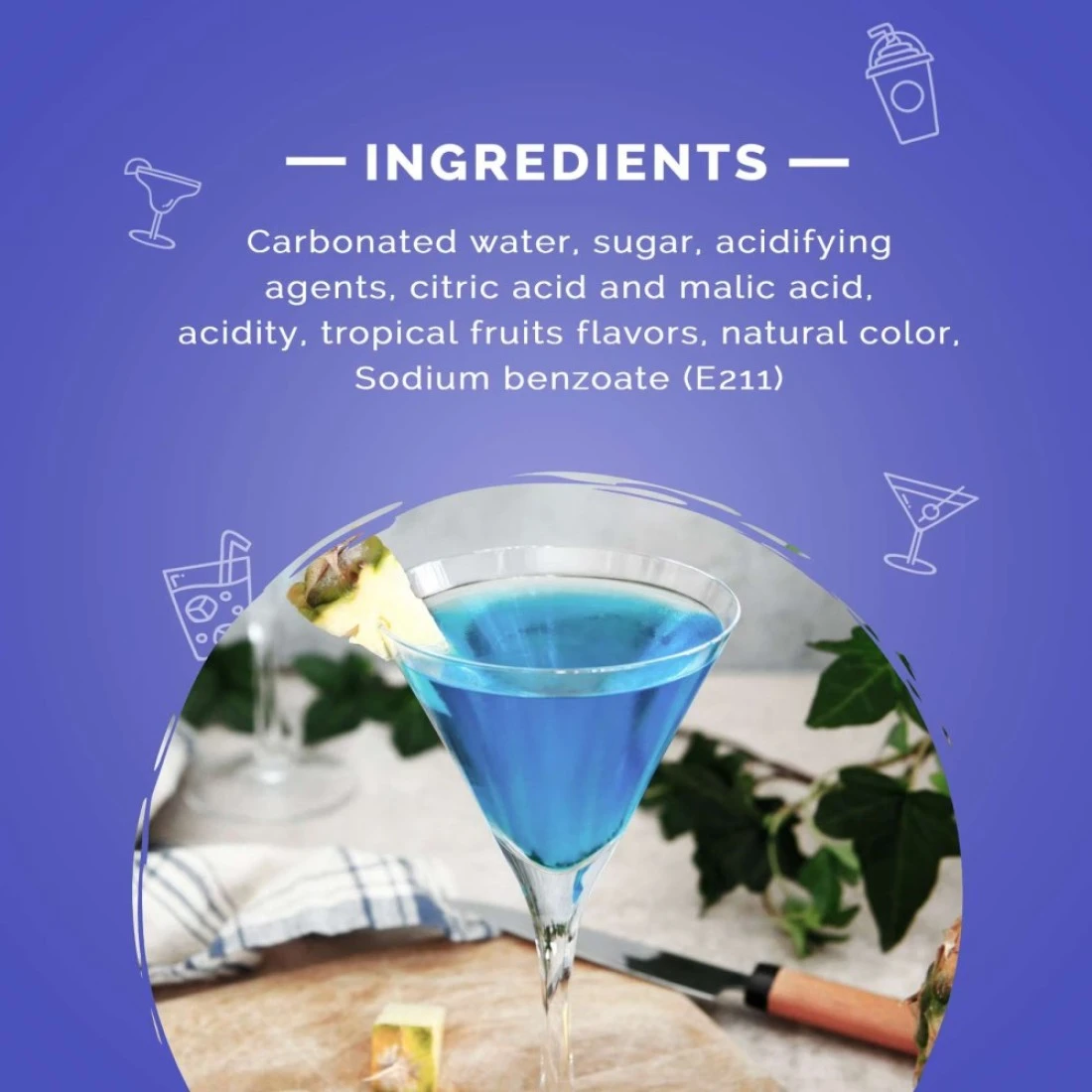 ingredients : ماء غازي، سكر، حامضين: حمض الستريك وحمض الماليك، مثبط الحموضة: سترات الصوديوم الثلاثي، نكهات الفواكه الإستوائية الطبيعية والمماثلة للطبيعية، مادة حافظة: بنزوات الصوديوم (E211)، لون صناعي: أزرق رقم 1 الغذائي والمشتق من FD&C (E133).
