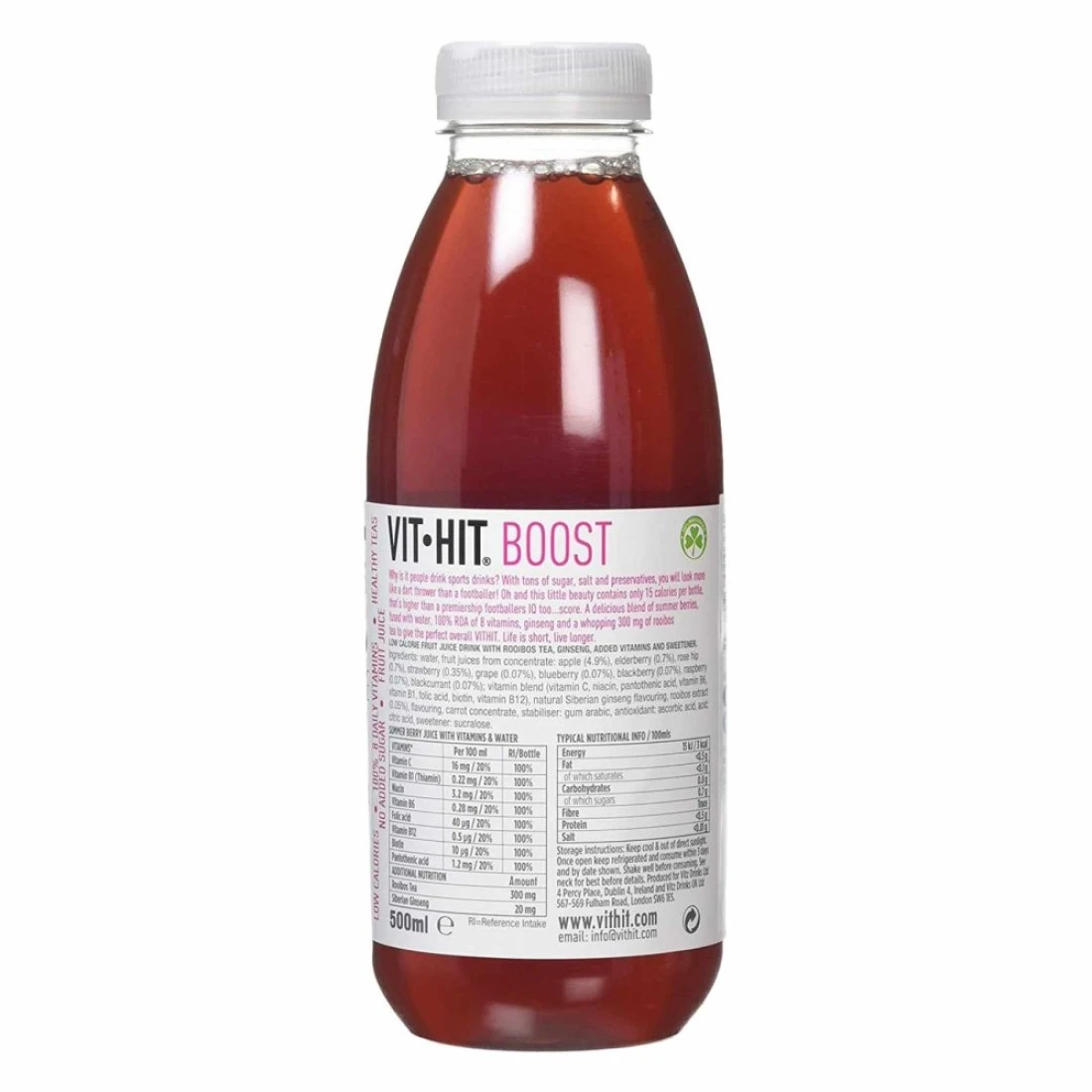 - يحتوي بوست باي فيت هيت على 100% من RDA من فيتامينات ب التي تطلق الطاقة، مع شاي الرويبوس المليء بمضادات الأكسدة.