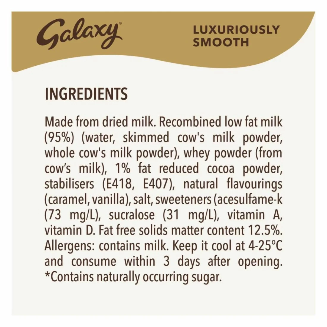ingredients : حليب قليل الدسم معاد تصنيعه (95%) (ماء، مسحوق حليب بقري منزوع الدسم، مسحوق حليب بقري كامل الدسم)، مسحوق مصل اللبن (من حليب البقر)، مسحوق كاكاو منخفض الدسم بنسبة 1%، مثبتات (E418، E407)، نكهات طبيعية (كراميل، فانيليا)، ملح، محليات (أسيسولفام-ك (73 مجم/لتر)، سكرالوز (31 مجم/لتر)، فيتامين أ، فيتامين د