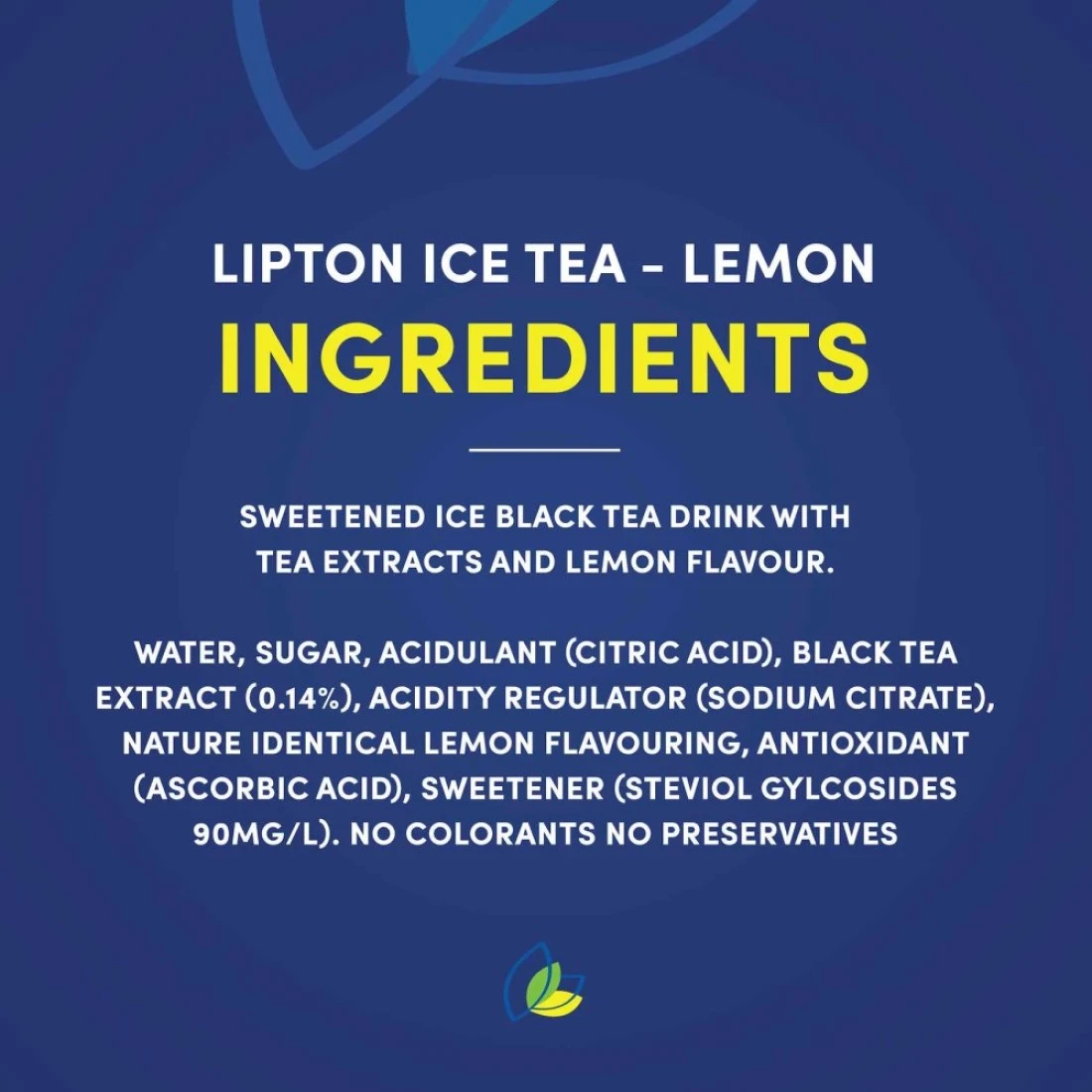 ingredients : ماء، سكر، محمض (حمض الستريك)، مستخلص الشاي الأسود (0.14%)، مثبت الحموضة (سترات الصوديوم)، نكهة الليمون مطابقة للطبيعة ، مضاد للأكسدة (حمض الأسكوربيك)، محلي (جلوكوزيدات ستيفيول) بتركيز 90 مغ/لتر.