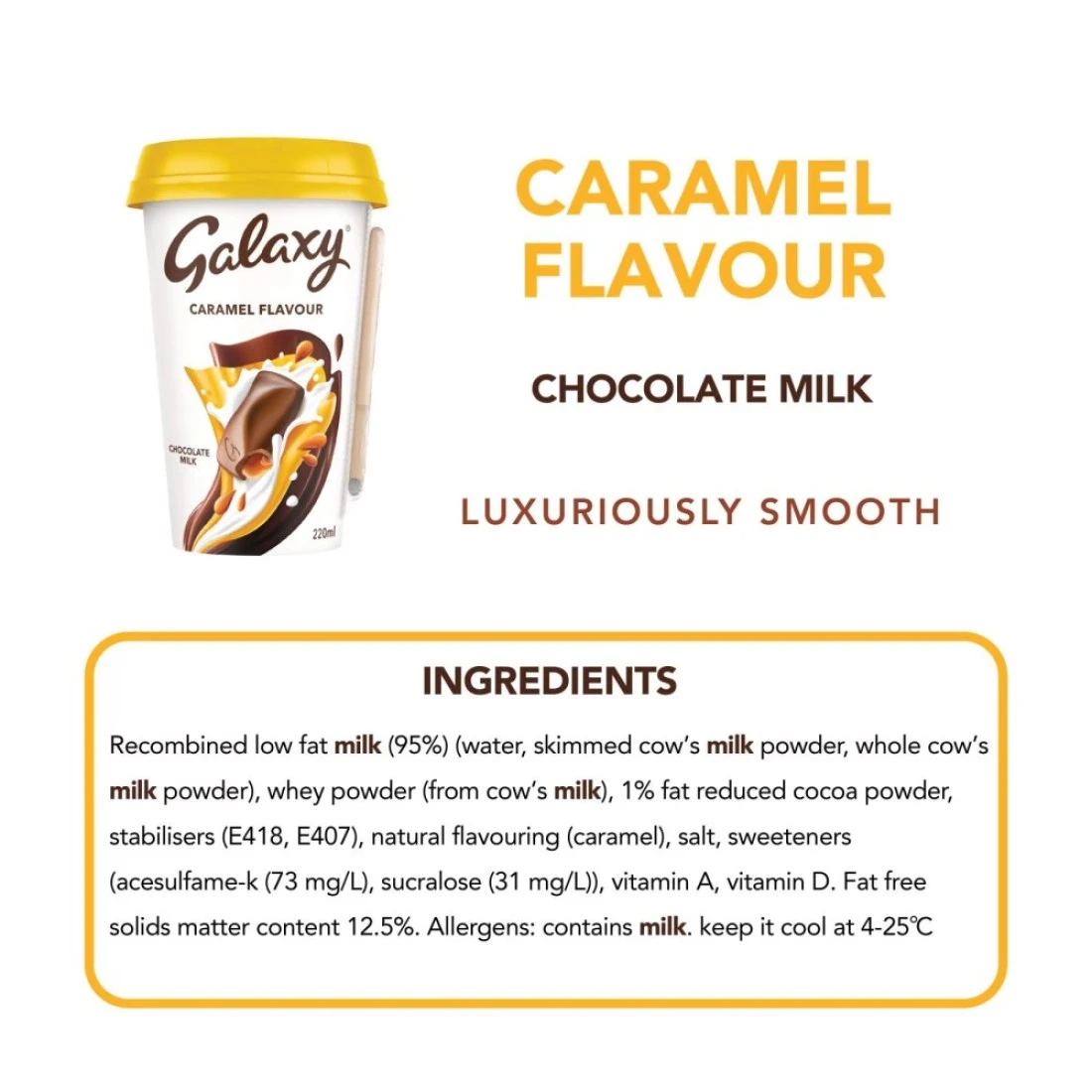 ingredients : حليب قليل الدسم معاد تركيبه (95%) (ماء، مسحوق حليب بقري منزوع الدسم، مسحوق حليب بقري كامل الدسم)، مسحوق مصل اللبن (من حليب البقر)، مسحوق كاكاو قليل الدسم 1%، مثبتات (E418، E407)، نكهة طبيعية (كراميل)، ملح، محليات (أسيسولفام-ك (73 ملغ / لتر)، سكرالوز (31 ملغ / لتر)) وفيتامين أ، فيتامين د. محتوى المواد الصلبة الخالية من الدهون 12.5%