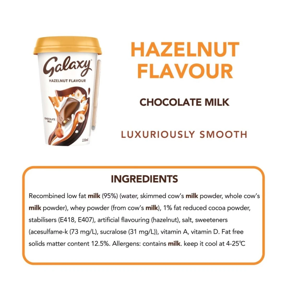 ingredients : حليب قليل الدسم معاد تركيبه (95%) (ماء، مسحوق حليب بقري منزوع الدسم، مسحوق حليب بقري كامل الدسم)، مسحوق مصل اللبن (من حليب البقر)، مسحوق كاكاو قليل الدسم 1%، مثبتات (E418، E407)، نكهات صناعية (بندق)، ملح، محليات (أسيسولفام-ك (73 ملغ / لتر)، سكرالوز (31 ملغ / لتر)) وفيتامين أ، فيتامين د. محتوى المواد الصلبة الخالية من الدهون 12.5%