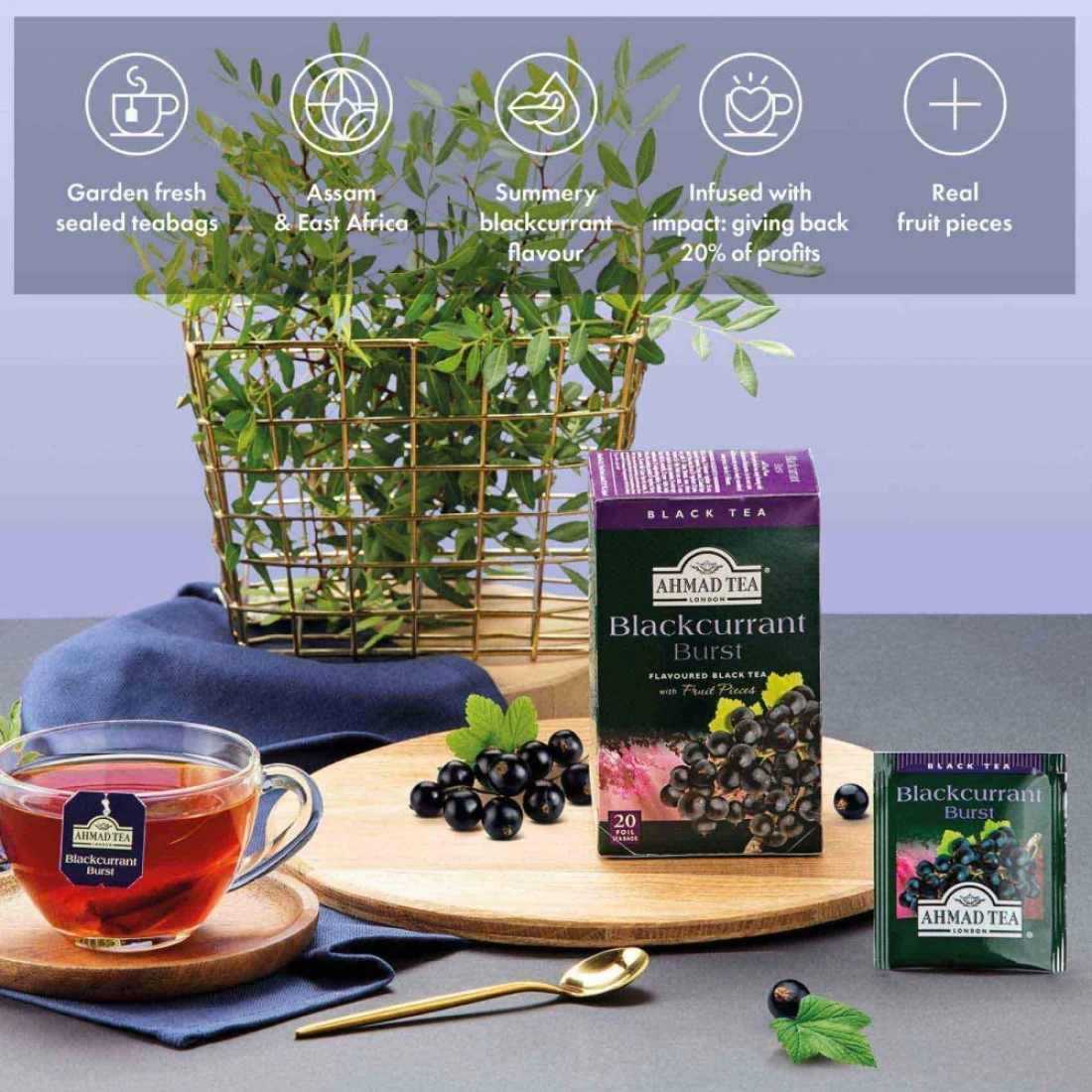 - استمتع بمزيج رائع من الشاي الأسود الممزوج بنكهة الكشمش الأسود الغنية