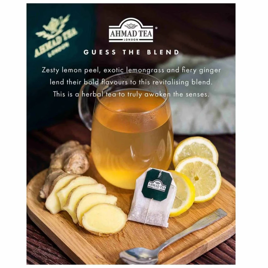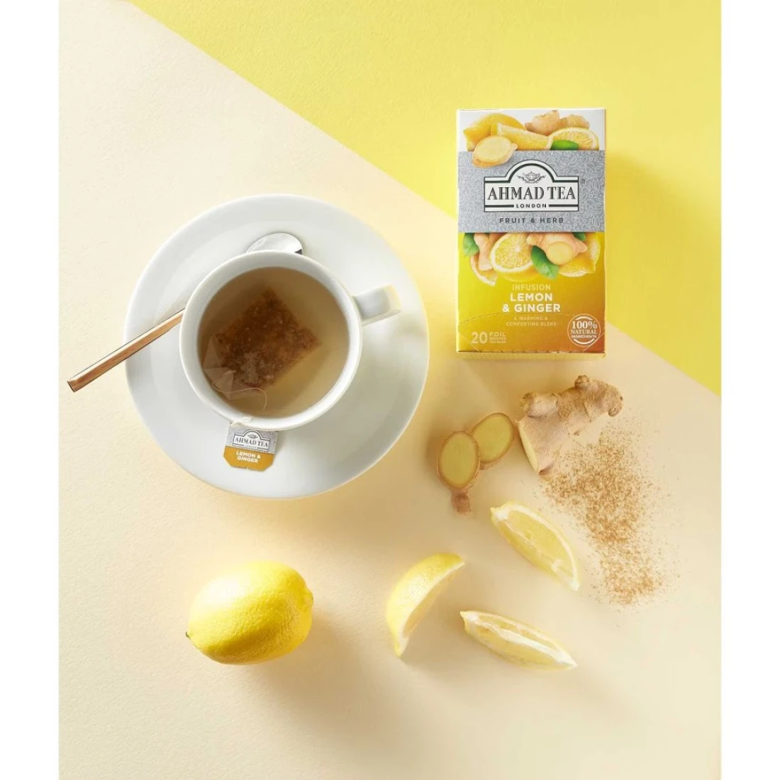 - استمتع بمزيج رائع من نكهات الليمون والزنجبيل في كل كيس شاي