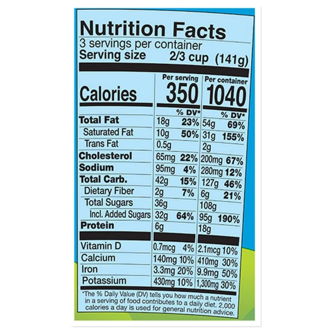 ingredients : كريمة، سكر سائل (سكر، ماء)، حليب خالي الدسم، ماء، سكر، كاكاو (معالج بالقلويات)، دقيق القمح، كاكاو، زيت فول الصويا، صفار البيض، سكر محول، بيض، بياض البيض، صمغ الغوار، ملح، كاراجينان، نكهة طبيعية، صودا الخبز، دقيق الشعير المملح