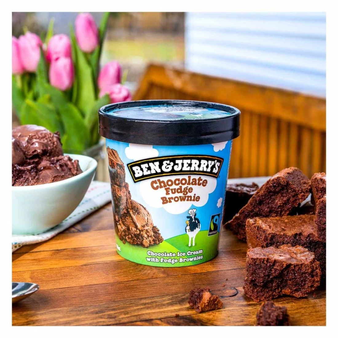 - انغمس في الملمس الغني والكريمي لآيس كريم بشوكولاطه براوني فادج من بن آند جيري، المصنوع من مكونات عالية الجودة للحصول على وجبة فاخرة