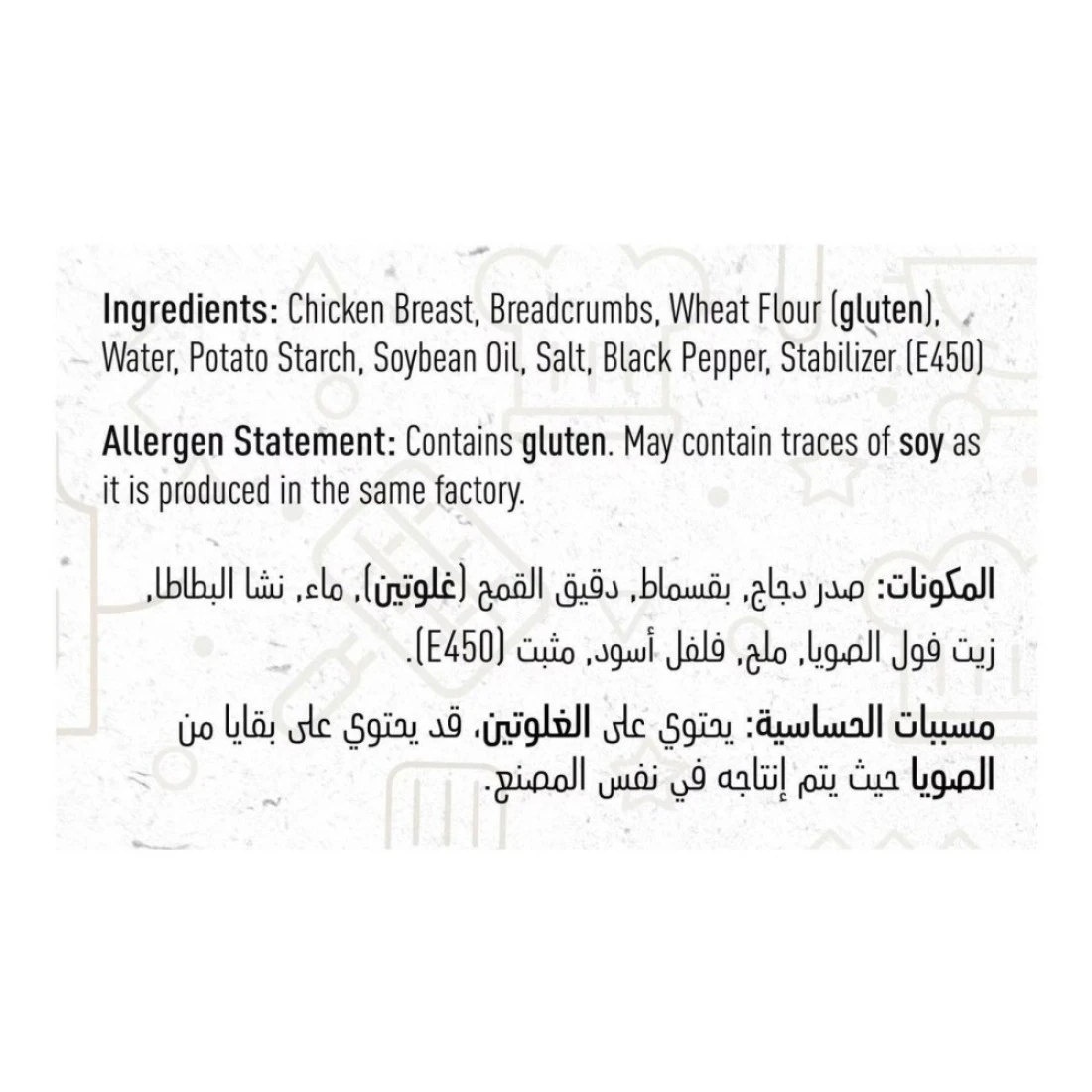 ingredients : صدور دجاج، فتات الخبز، طحين قمح (خالي من الغلوتين)، ماء، نشا بطاطس، زيت فول الصويا، ملح، فلفل أسود، مثبت (E450)