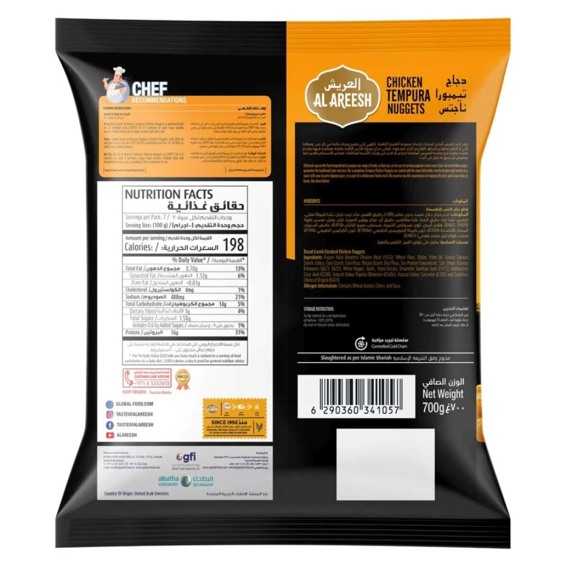 ingredients : لحم دجاج حلال مجمد بدون عظم (655)، دقيق القمح، ماء، زيت النخيل، نشاء تابيوكا أصلي، كرفس، نشاء الذرة، دقيق الذرة، نشاء البطاطس، دقيق الأرز، مركز بروتين الصويا، ملح، بصل، معززات النكهة (E621، E625)، أبيض فلفل، ثوم، خلاصة الخميرة، مستحلب صمغ الزانثان (E415)، حمض ستريك مضاد للأكسدة (E330)، لون طبيعي بابريكا أوليوريسين (E160c)، كركم طبيعي اللون (E100)، مثبت (أصل معدني) (E451).
