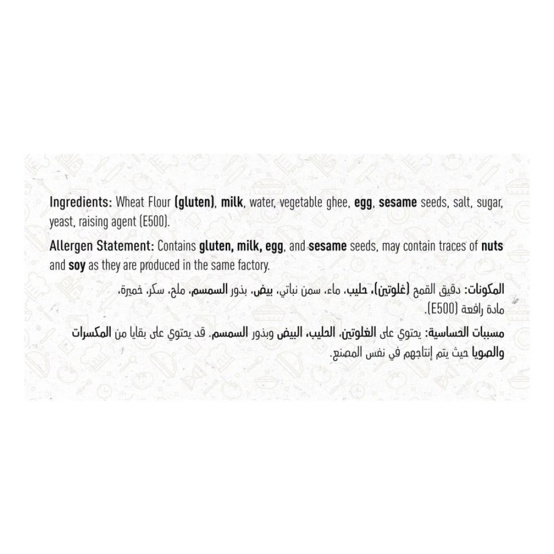 ingredients : دقيق القمح (الجلوتين)، الحليب، الماء، السمن النباتي، البيض، بذور السمسم، الملح، السكر، الخميرة، عامل التخمير (E500)