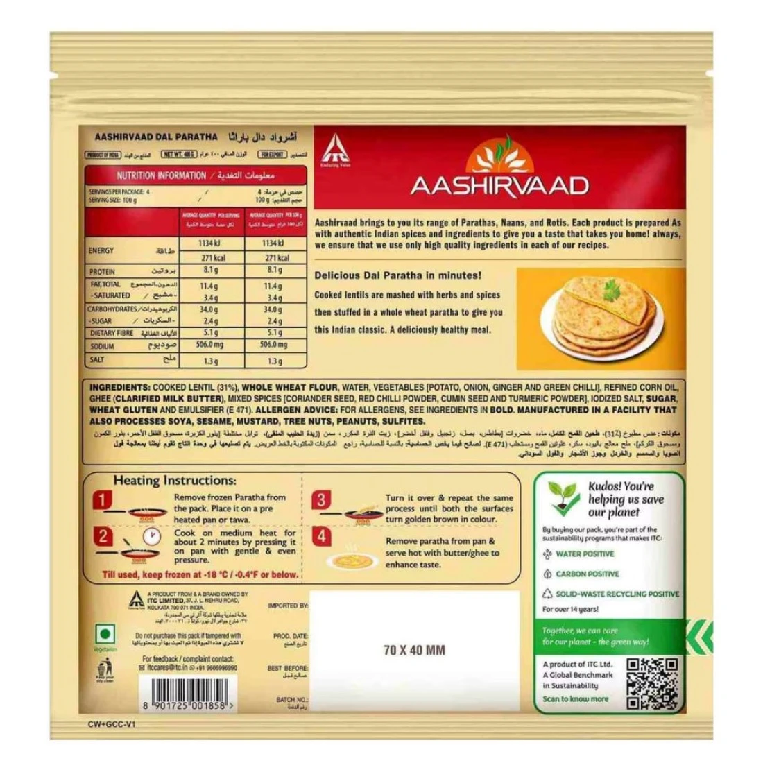 ingredients : عدس مطبوخ (31%)، دقيق القمح الكامل، ماء، خضار (بطاطا، بصل، زنجبيل، فلفل أخضر حار)، زيت ذرة مكرر، سمن (زبدة حليب مصفاة)، بهارات مشكلة [بذور كزبرة، مسحوق فلفل أحمر، بذور كمون وكركم مسحوق]، ملح مدعم باليود، سكر، غلوتين القمح، مستحلب (إي 471).