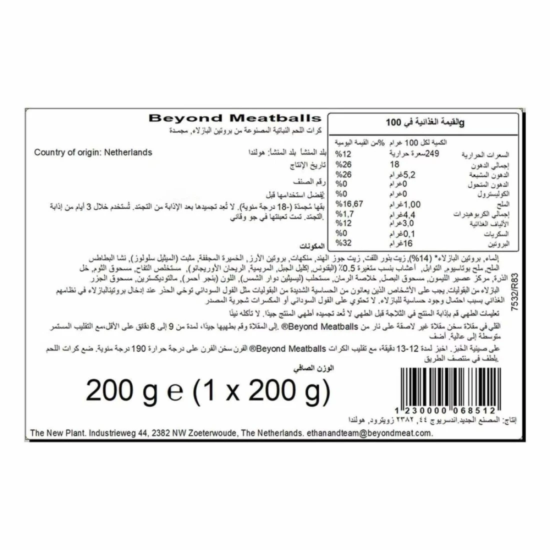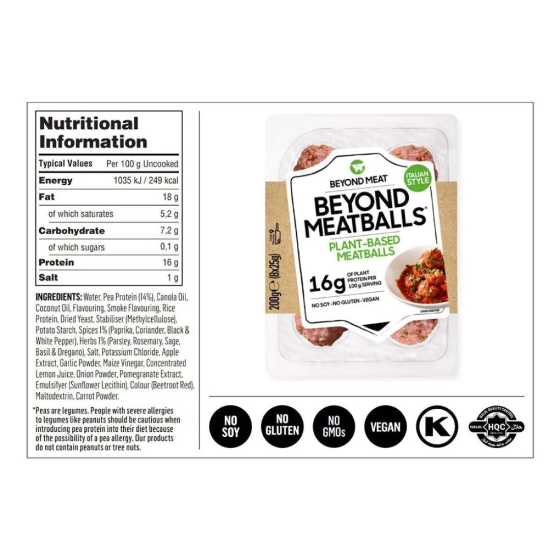 ingredients : ماء، بروتين البازلاء (14٪). زيت الكانولا، زيت جوز الهند، منكه، نكهة الدخان، بروتين الأرز، خميرة مجففة، مثبت (ميثيل سلولوز). نشا البطاطس، بهارات 1٪ (فلفل أحمر، كزبرة، فلفل أسود وأبيض). أعشاب (بقدونس، إكليل الجبل، مريمية، ريحان، زعتر). ملح، كلوريد البوتاسيوم، مستخلص التفاح، مسحوق الثوم، خل الذرة، عصير الليمون المركز، مسحوق البصل، مستحلب مستخلص الرمان (ليسيثين عباد الشمس). لون (شمندر أحمر). مالتوديكسترين، مسحوق الجزر