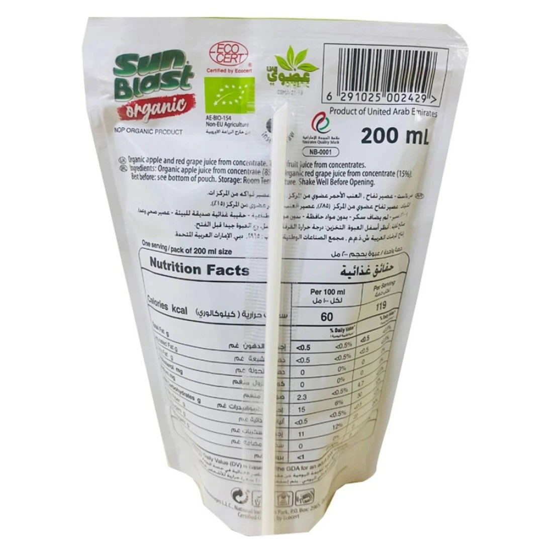 ingredients : عصير التفاح العضوي من المركز (85%)، عصير العنب الأحمر العضوي من المركز (15%)