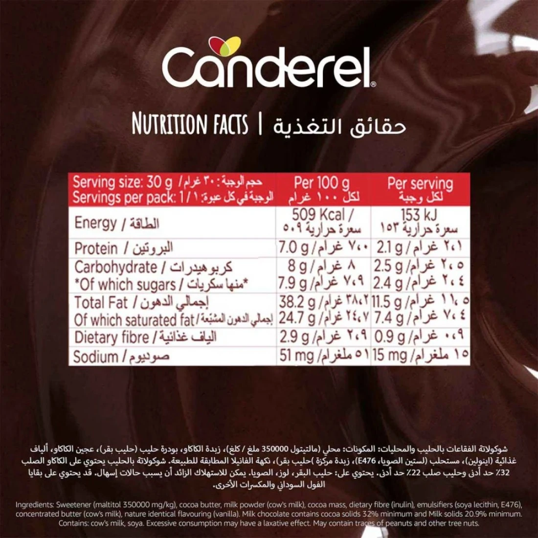 ingredients : زبدة الكاكاو، محلي (مالتيتول E965-i)، إينولين (ألياف)، مسحوق حليب (حليب بقري)، كتلة كاكاو، زبدة مركزة (حليب بقري)، مستحلبات (صويا - E322، E476))، أسبارتام (محلي غير غذائي) E951) نكهة (الفانيليا) جوامد الكاكاو: 34% جوامد الحليب: 22% كحد أدنى. (قد يحتوي على الفول السوداني والمكسرات الأخرى)