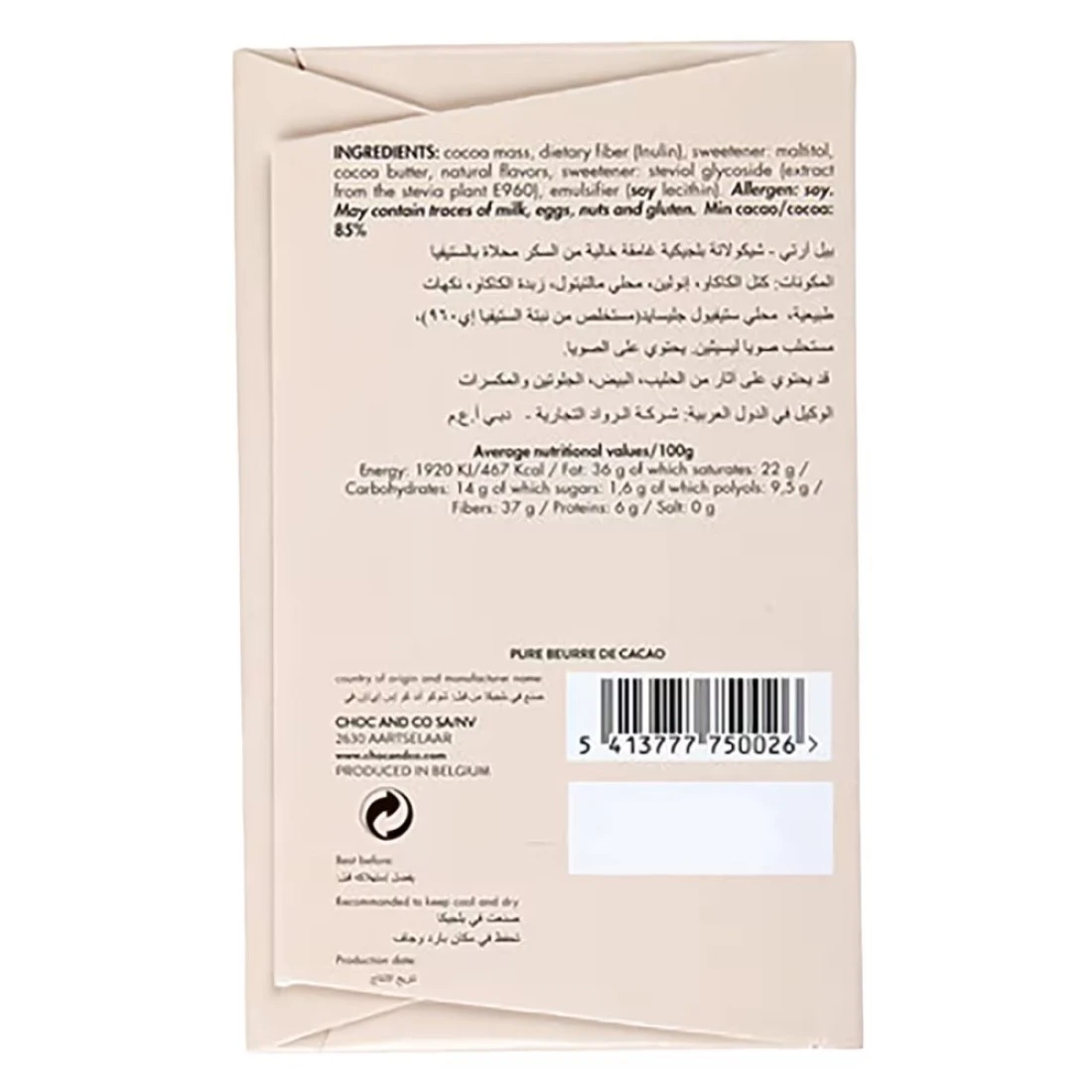 ingredients : كتلة الكاكاو، الألياف الغذائية (إينولين)، محلى، مالتيتول، زبدة الكاكاو، نكهات طبيعية، محلى ستيفيول غليكوسيد.