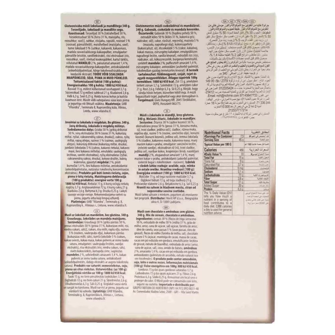 ingredients : الحنطة السوداء 15٪، الدخن المبثوق 15٪ (الدخن 31٪، حصى الذرة، أرز، قصب السكر، ملح الطعام)، سكر، دقيق الأرز، زيت بذور اللفت، رقائق الذرة (دقيق الذرة، ملح الطعام)، شوكولاته 5٪ (سكر، كتلة الكاكاو، زبدة الكاكاو، سكر العنب، مستحلب: ليسيثين الصويا، نكهة فانيليا طبيعية)، زبيب 5٪ (زبيب 99.5٪، زيت دوار الشمس)، أرز مقذوف (أرز، قصب السكر ، ملح طعام)، جوز الهند 3.5٪، نشاء بطاطس، لوز 2٪، مسحوق كاكاو قليل الدسم، قطيفة منتفخة 1.5٪، مضاد للأكسدة (أسكوربيل بالميتات، مستخلص توكوفيرول الغني (طبيعي)، ليسيثين دوار الشمس).