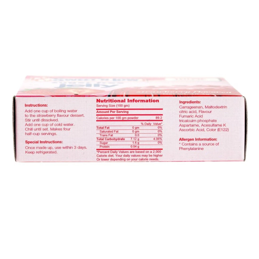 ingredients : كاراجينان، حمض الستريك، نكهة حمض الفوماريك، أسبارتام، حمض الأسكوربيك، لون (E122)