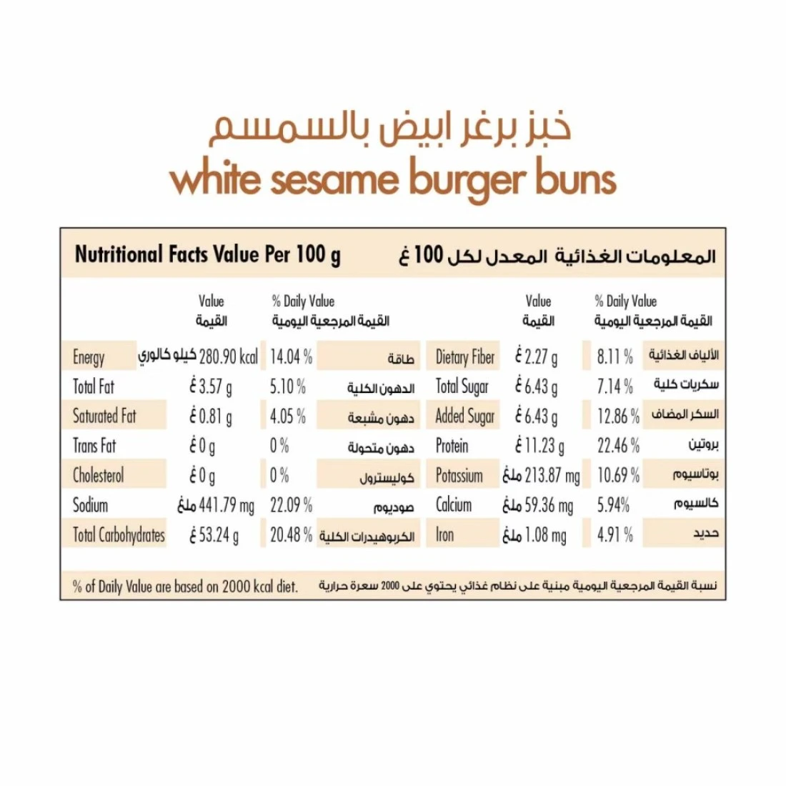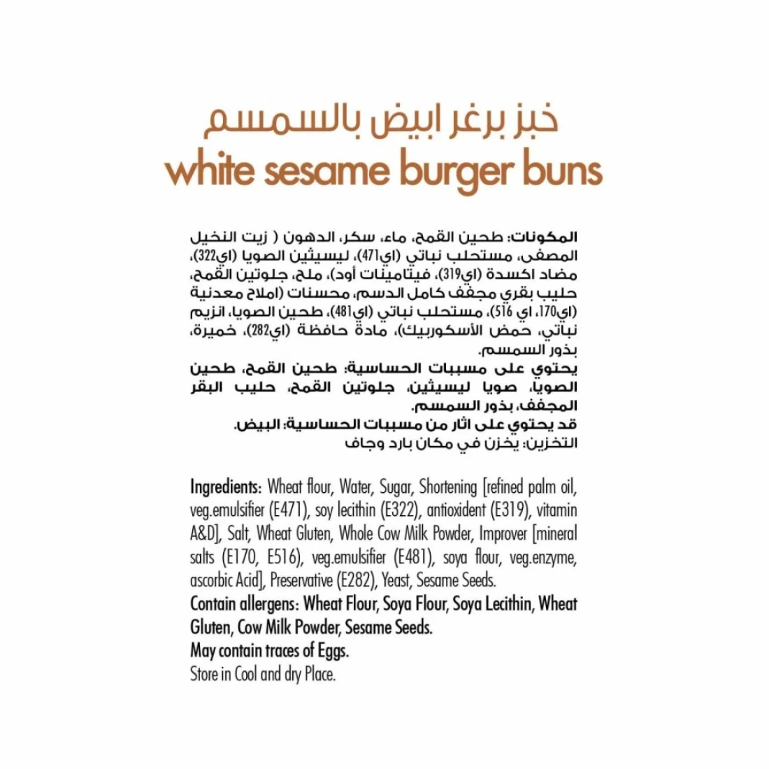 ingredients : دقيق قمح ، ماء ، سكر ، خضار. دهن ، ملح ، خميرة ، سمسم ، مستحلب (E472e) ، بروبيونات الكالسيوم الحافظة ، حمض الأسكوربيك ، فيتامين C ، مضاد للأكسدة
