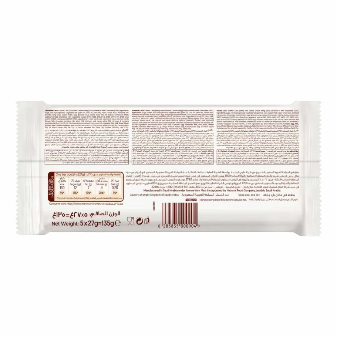 ingredients : مكونات كعكة الشوكولاتة: السكر والدهون النباتية غير المهدرجة (زيت النخيل وزيت الذرة ودهن النخيل) والماء ودقيق القمح ومسحوق الحليب منزوع الدسم والسكر البودرة وزبدة الكاكاو والبيض وشراب الجلوكوز وكتلة الكاكاو ودهن الحليب واللاكتوز والمرطب (E422) والمثبت (E1422) والمستحلبات من مصدر نباتي (E471 وE1520 وE491 وE475 وE422 وE477 وE407 وE433 وليسيثين الصويا (E322]] وعوامل التخمير (E450 وE500) وزلال البيض ونشا الذرة والملح ونكهة الفانيليا الطبيعية والمماثلة للطبيعة. مكونات كعكة البندق: السكر والماء والدهون النباتية غير المهدرجة (زيت النخيل والذرة الكاملة ودهن النخيل) ودقيق القمح ومسحوق الحليب منزوع الدسم وزبدة الكاكاو والبيض سكر بودرة، كريمة البندق (3.9%)، كتلة الكاكاو، شراب الجلوكوز، دهن الحليب، اللاكتوز، مادة مرطبة (E422)، مثبت (E1422)، مستحلبات من مصدر نباتي (E471، E1520، E491، E475، E422، E477، E407، E433، ليسيثين عباد الشمس (E322))، مسحوق الكاكاو، عوامل التخمير (E450، E500)، بياض البيض، نشا الذرة، ملح، نكهات طبيعية ومماثلة للطبيعة (بندق، فانيليا). مكونات كعكة الفانيليا: سكر، دهون نباتية غير مهدرجة (زيت النخيل، زيت الذرة، دهن النخيل)، ماء، دقيق القمح، مسحوق حليب منزوع الدسم، سكر بودرة، زبدة الكاكاو، بيض، شراب الجلوكوز، كتلة الكاكاو الطبيعية، دهن الحليب، اللاكتوز، مادة مرطبة (E422)، مثبت (E1422)، مستحلبات من مصدر نباتي (E471، E1520، E491، E475، E422، E477، E407، E433، ليسيثين الصويا (E322]])، عوامل التخمير (E450، E500]، بياض البيض، نشا الذرة، ملح، نكهات الفانيليا الطبيعية والمتطابقة مع الطبيعة والاصطناعية