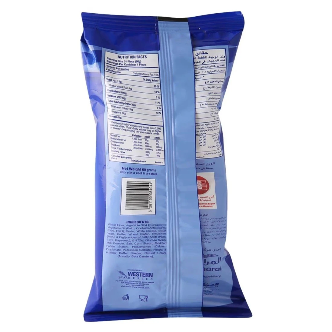 ingredients : دقيق قمح ، زيت نباتي وزيت نباتي مهدرج (نخيل ، يحتوي على مضادات الأكسدة: E320 ، E321) ، ماء ، جبنة بيضاء ، سكر ، خميرة ، زبدة ، جلوتين القمح ، مستحلب (دهون أحادية وثنائية الأحماض الدهنية (نخيل ، صويا ، بذور اللفت) ، E472e) ، شراب الجلوكوز ، مسحوق الحليب ، ملح ، نشاء ذرة ، نشاء بطاطس معدل ، مواد حافظة (بروبيونات الكالسيوم ، سوربات البوتاسيوم) ، نكهة زبدة طبيعية وإصطناعية ، ألوان طبيعية (أناتو ، بيتا كاروتين)