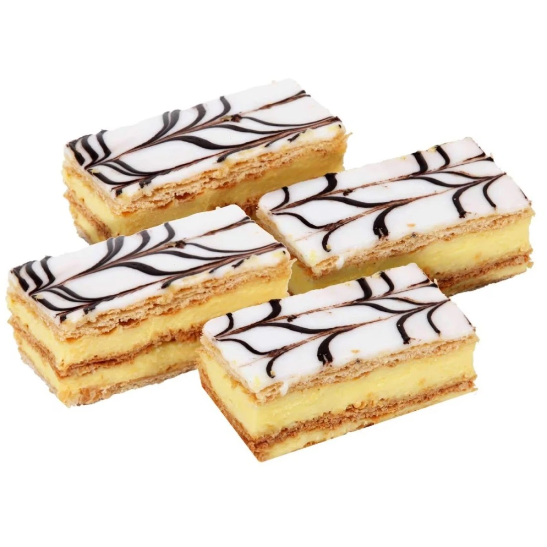 ingredients : عجينة بف باستري (دقيق، ملح، زبدة، ماء)، كريمة خردل (مسحوق خردل)، ماء، سكر بودرة، فوندان.