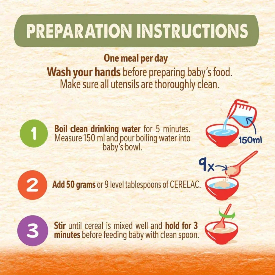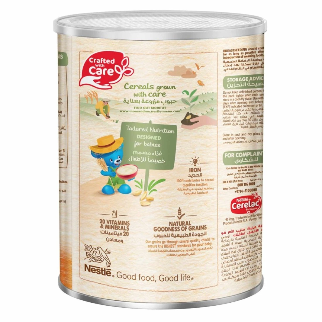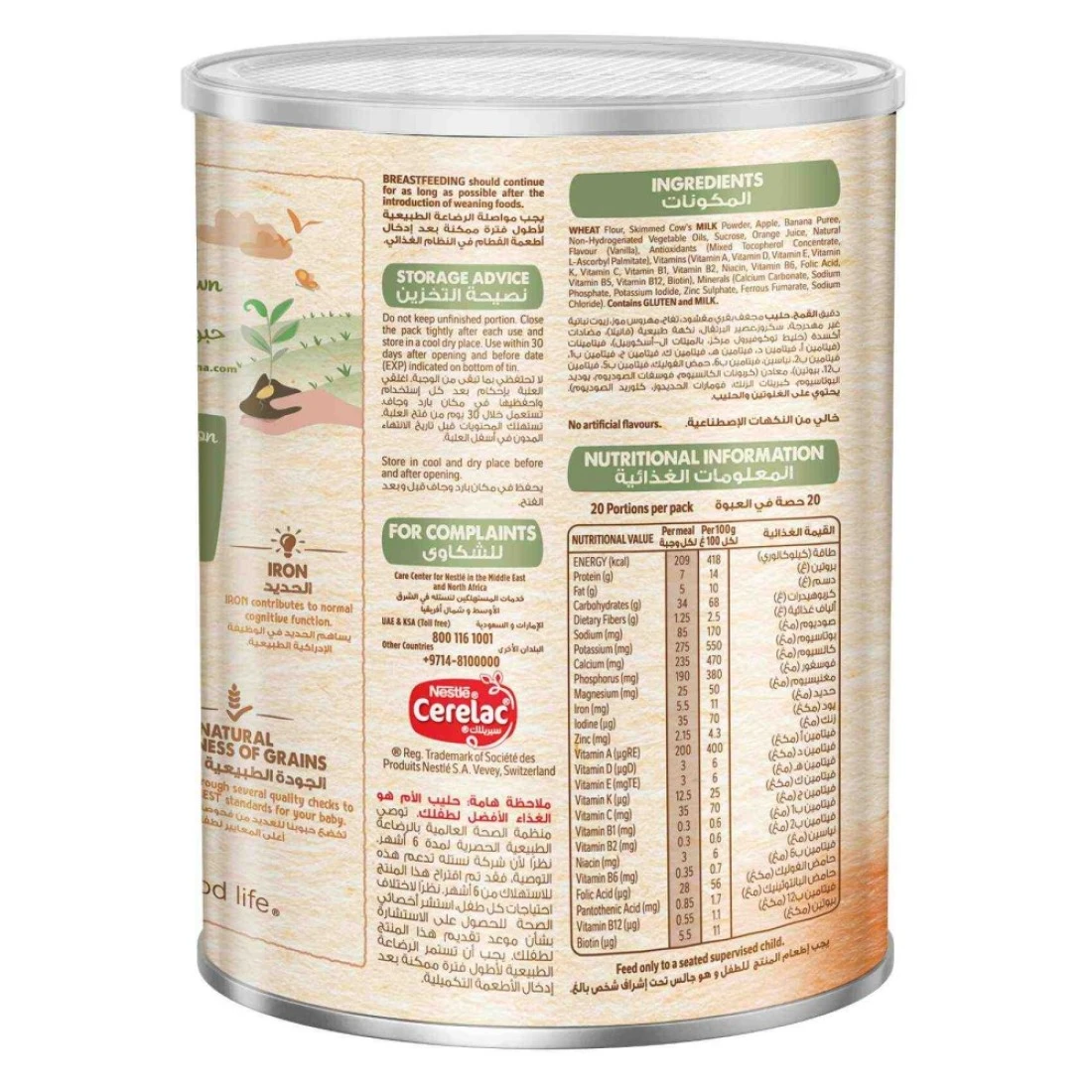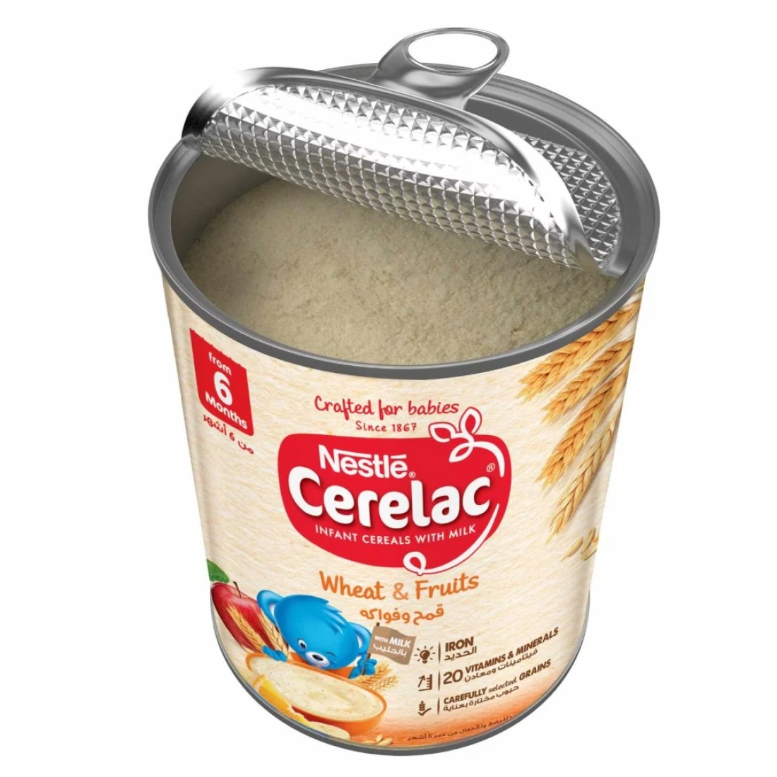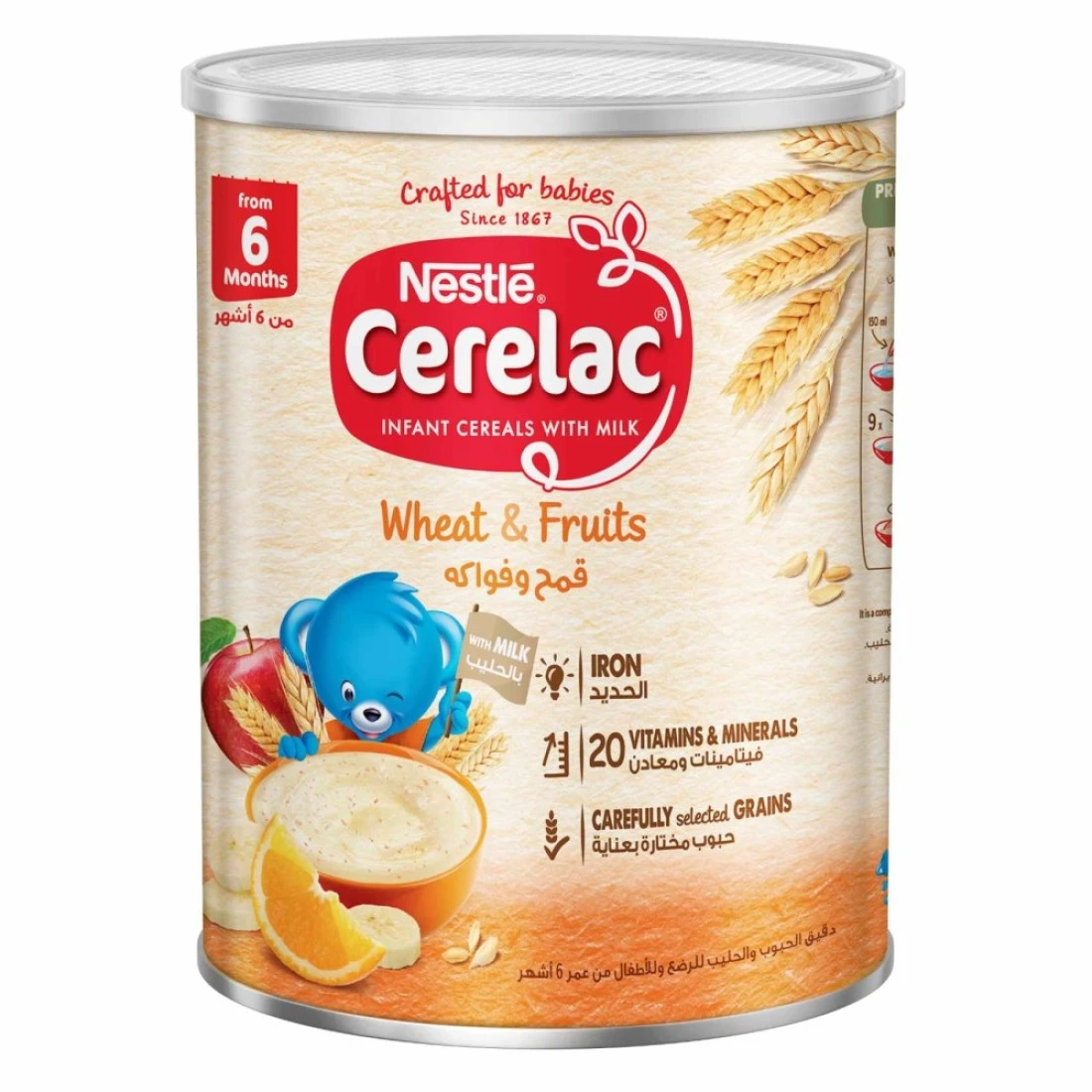 قمح وفواكه للأطفال مع الحليب من نستله سيريلاك مُدعّم بـ 16 فيتامينًا ومعادن (بما في ذلك الحديد والكالسيوم وفيتامين د). مُحضّر من حبوب مختارة بعناية، وخالي من المواد الحافظة والألوان والنكهات الاصطناعية. تغذية مُخصصة للأطفال من عمر 6 أشهر فما فوق.